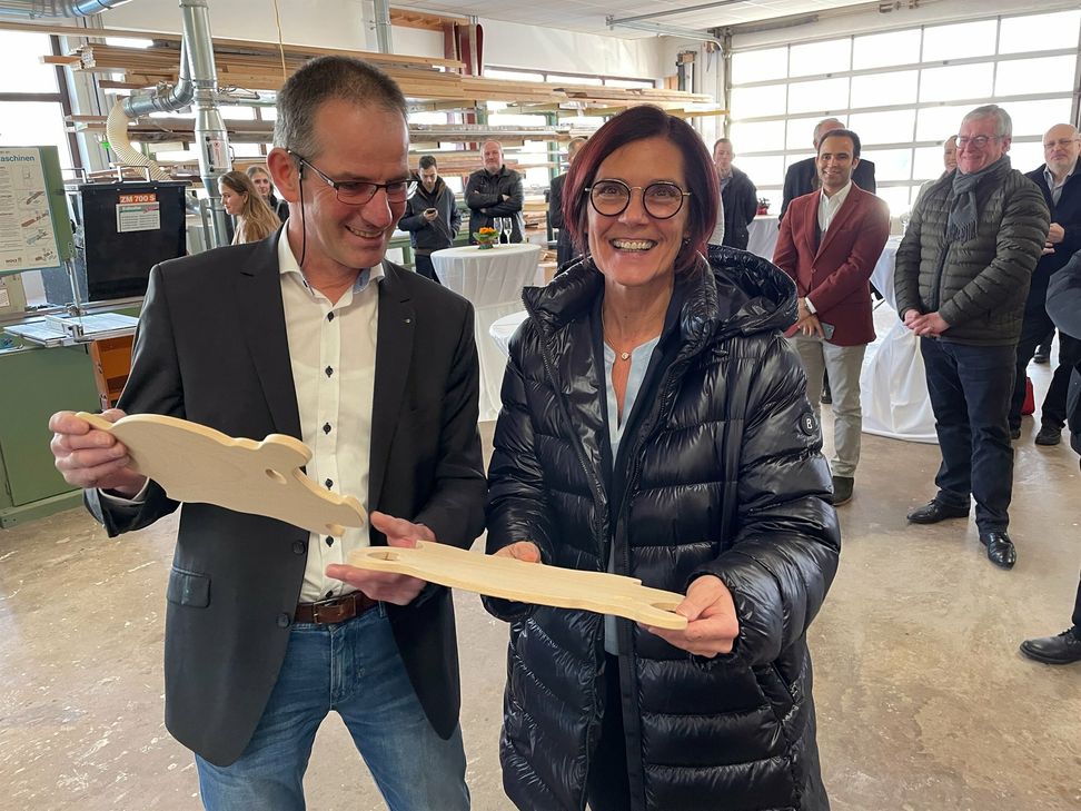 Rita Lanius-Heck, die Erste Kreisbeigeordnete des Rhein-Hunsrück-Kreises und Stadtbürgermeister Dr. Andreas Nikolay hatten zuvor in ihren Grußworten die Bedeutung der Holzwirtschaft für die Region sowie des Werkstoffes Holz im Allgemeinen betont. Holz liege als nachwachsender, nachhaltiger Werkstoff vollkommen zu Recht im Trend. Bürgermeister Nikolay erklärte, dass eine Reihe kommunaler Einrichtungen mit Holzschnitzeln beheizt würden, Holz als Brennstoff habe im Hunsrück eine lange Tradition. Rudi Müller, Präsident der Handwerkskammer Trier und selbst Tischlermeister beließ es bei einem kurzen, humorvollen Gruß, er habe dem vielen Lob nichts mehr hinzuzufügen als "Gott schütze das ehrbare Handwerk!"