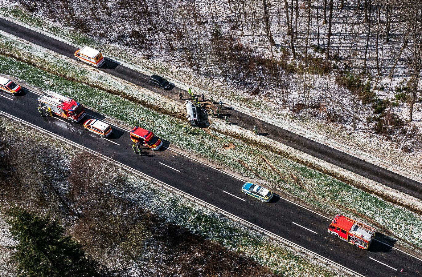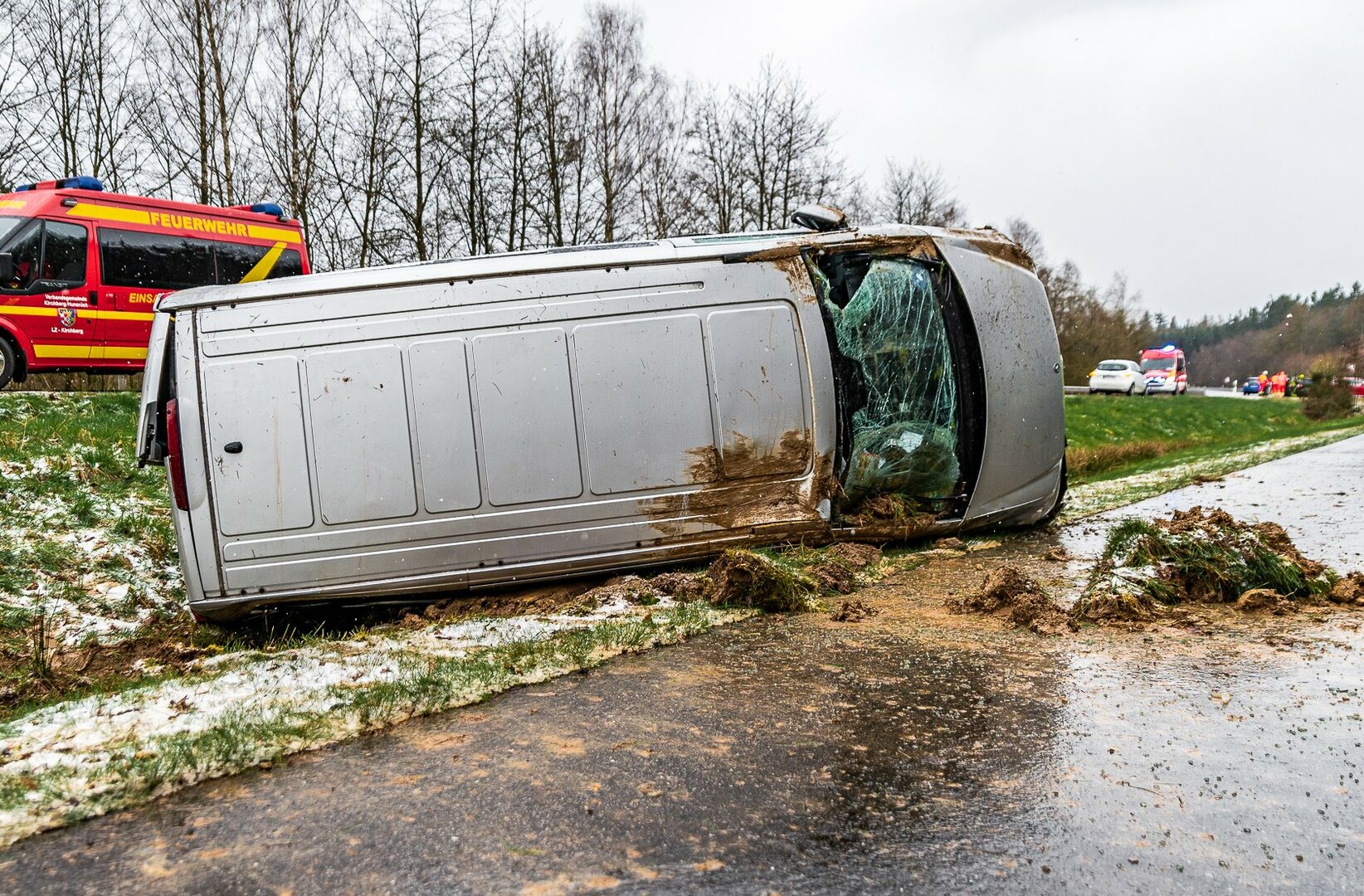 Gegen 10.40 Uhr kam ein mit insgesamt acht Personen besetzter Mercedes-Benz Vito, vermutlich aufgrund nicht angepasster Geschwindigkeit bei schlechten Witterungsverhältnissen, von der Fahrbahn ab und kollidierte dort mit der sich in der Böschung befindlichen Bepflanzung, berichtet die Polizei.