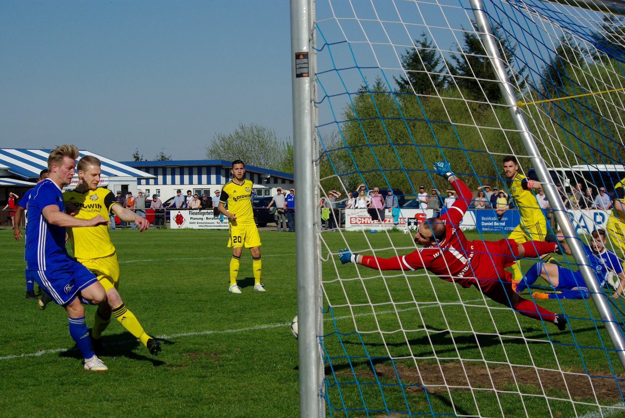 Von Arno Boes. Das Spiel auf dem Quintinsberg vor 273 Zuschauern begann direkt mit einem Paukenschlag. Schon in der vierten Minute unterlief der Hertha-Abwehr ein grober Fehler, Oscar Feilberg schnappte sich den Ball, spielte einen Verteidiger und dann auch den Torwart aus und markierte mit dem Schuss ins leere Tor den 1:0-Führungstreffer für Karbach. Danach war das Spiel geprägt von starken Abwehrleistungen auf beiden Seiten, die nur selten weitere Chancen zuließen. Auch dem Ausgleich der Saarländer in der 31. Minute ging ein Abwehrfehler voraus. Marc Beck verrechnete sich bei einem 50-Meter-Pass der Wiesbacher völlig, den von Beck unterlaufenen Ball setzte Rudy Mpassi für die Hertha ins lange Karbacher Toreck. Die zweite Halbzeit lebte von der Spannung, ob nicht doch noch auf einer Seite der Siegtreffer fällt. Chancen hatten die Karbacher dazu u.a. durch Dominik Kunz und auch Julian Hohns, doch Wiesbachs Torhüter Wamsbach war jeweils auf dem Posten. Das galt in den letzten zehn Minuten auch für Karbachs Keeper Lukas Schmitt, der mindestens bis zum Saisonende den verletzten Florian Bauer (Kreuzbandriss) vertreten wird. Schmitt wehrte mit Glanzparaden zwei Schüsse auf sein Tor in der 83. und 87. Minute ab, hielt damit den Punkt für das Unentschieden fest. Das war dann auch am Ende völlig gerecht. Karbach hatte insgesamt ein paar mehr Chancen, Wiesbach blieb aber durch sein schnelles Umschaltspiel und die daraus entstehenden Kontersituationen bis zum Schluss gefährlich. Die beiden Trainer Torsten Schmidt und Michael Petry sahen es nach dem Schlusspfiff ähnlich und waren mit dem Punktgewinn durchaus zufrieden. Den Punkt hätte Julian Feit und sein TSV-Team auch gerne aus Pfeddersheim mitgenommen. Aber am Ende stand es 1:0 für die Platzherren. Ihr Torjäger Andreas Buch erzielte in der 54. Minute das Tor des Tages, ist mit 19 Saisontreffern Ligakönig. In der ersten Halbzeit machten die Wormser Vorstädter das Spiel, doch Emmelshausen hielt mit seiner stabilen Abwehr dagegen. „Wir haben da aber zu wenig agiert“, meinte Feit nach dem Spiel, „da wäre vielleicht mehr drin gewesen.“ Nach dem Führungstreffer der TSG stellte er um, brachte Eric Milz in den TSV-Angriff. Damit lief das Spiel der Hunsrücker nach vorne besser und fast wäre dem 18-jährigen Milz auch noch der Ausgleich gelungen. In der 79. Minute kam er freistehend zum Kopfball, der Ball ging aber genau gegen den Pfosten. Unter dem Strich zeigte der TSV Emmelshausen erneut eine überzeugende Leistung, was auch TSG-Trainer Heidemann anerkannte: „Mit 58 haben wir die meisten Saisontore in der Liga erzielt. Gegen Emmelshausen reichte es in beiden Spielen aber nur zu diesem einen Treffer. Das zeigt, wie stark die Hunsrücker tatsächlich sind.“ Leider müssen die nun im kommenden Spiel gegen den Mitabstiegskandidaten Jägersburg neben Nils Bast auch Luca Wolf ersetzen, der in der 88. Minute vom insgesamt schwachen Schiedsrichter die gelb-rote Karte sah. Das Spiel gegen den FSV Jägersburg wird am kommenden Samstag (27. April) bereits um 14.30 Uhr auf dem Emmelshausener Kunstrasen angepfiffen. Genau zeitgleich spielt der FC Karbach beim SV Röchling Völklingen.