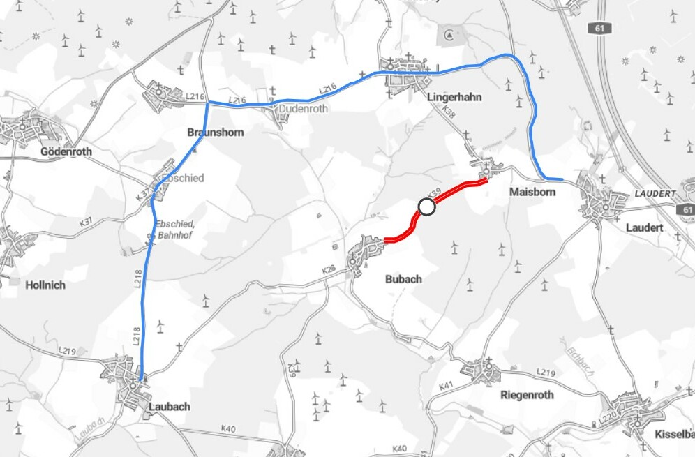 Aufgrund der umfangreichen Bauarbeiten und der zur Verfügung stehenden Fahrbahnbreite kann die Baumaßnahme aus Gründen der Sicherheit nur unter Vollsperrung der K 39 für den Durchgangsverkehr ausgeführt werden. Die ausgeschilderte Umleitung führt über Ebschied und Lingerhahn.