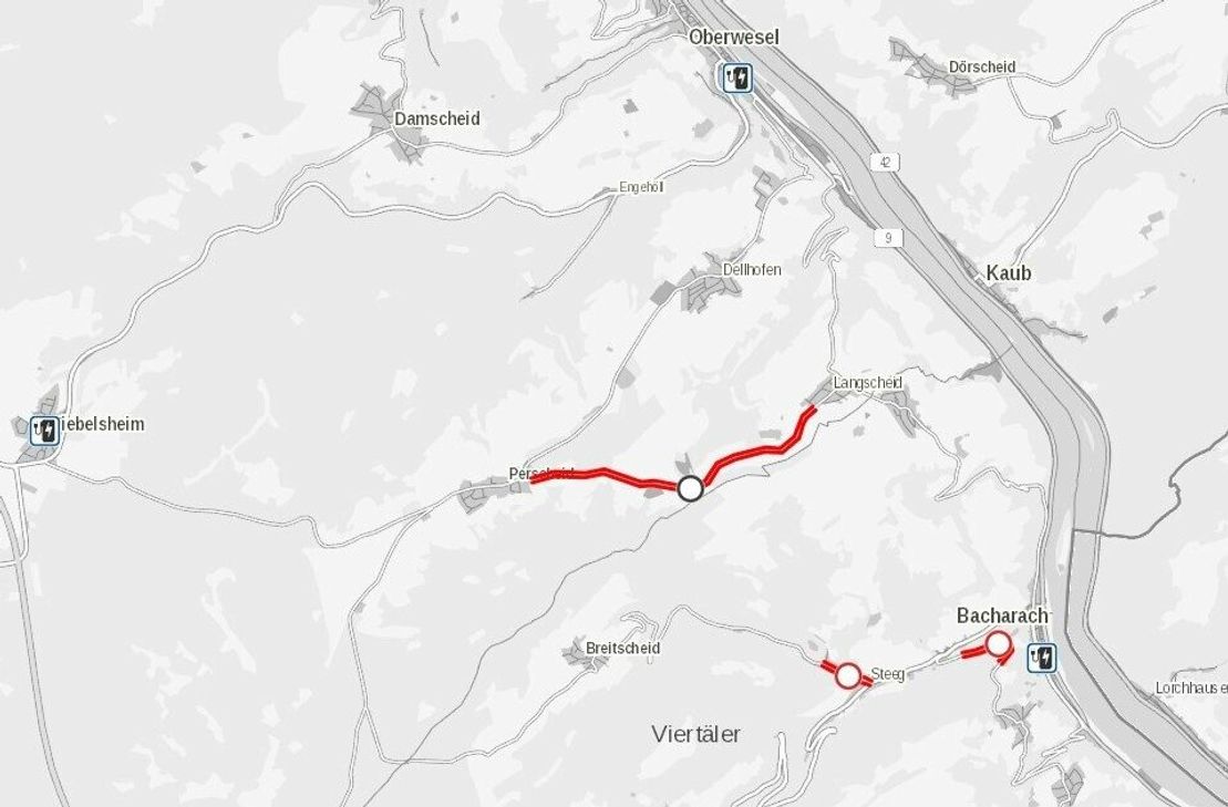 Ab Bacharach wird der Zielverkehr Perscheid über die B 9 bis zur Einmündung L 220, dann weiter über Wiebelsheim nach Perscheid geführt.