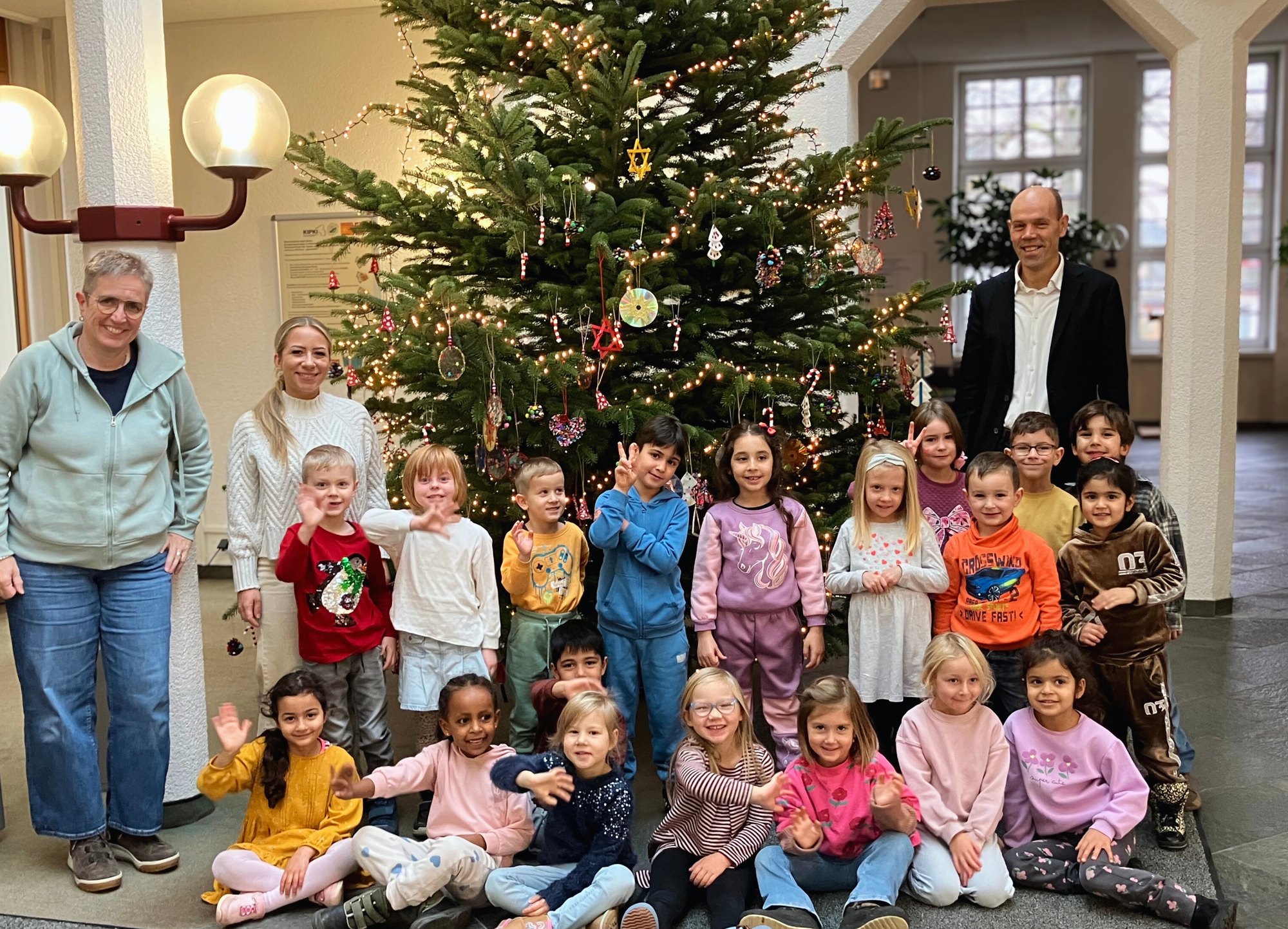 Der Landrat begrüßte die Kinder herzlich und freute sich, dass das Weihnachtsbaumschmücken auch in diesem Jahr wieder stattfinden konnte. Die Kleinen brachten liebevoll selbstgebastelten Weihnachtsschmuck mit: glänzende Sterne aus Bügelperlen, bunte Zuckerstangen, kleine Pilze und dekorierte Tannenzapfen, die den Baum zu einem bunten Lichtermeer machten.