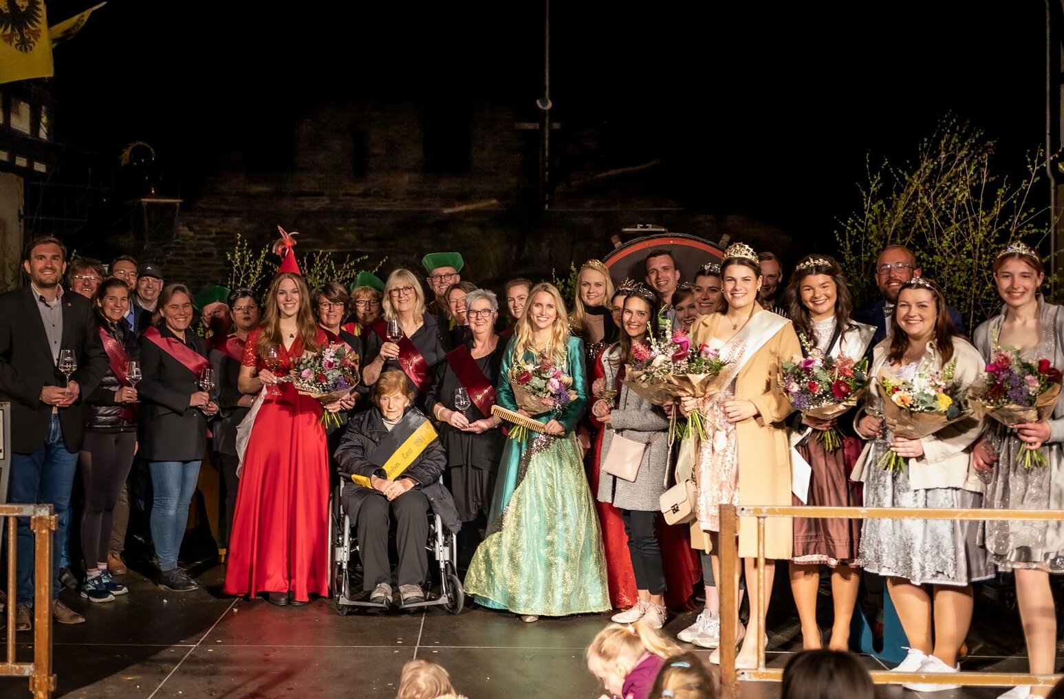 Maximilian Lambrich begrüßte nicht nur die Gäste des Abends, er führte auch durch den Sonderprogrammpunkt in diesem Jahr. Eine ganze Schar "alter" Weinhexen versammelte sich auf der Bühne, um ihre Begeisterung für das Amt der Weinhex' mit den Zuschauern zu teilen. Der Zeremonie wohnten in diesem Jahr die Mittelrheinweinkönigin Verena samt Prinzessinnen und Prinz, die Loreley Katharina, die Winninger Weinkönigin Michelle mit der Weinhex' Therese, die Prinzess Schwätzerchen Annalena mit Weinprinzessin Melina aus Bingen, die Weinprinzessinnen Lilly und Franziska aus Lorch, Bacchus Felix aus Boppard und Vertreter der Weinbruderschaft "Les Piliers Chablisiens" bei, die den teilweise weiten Weg gerne auf sich nahmen, um auf dem historischen Marktplatz dieses traditionelle Ereignis zu feiern.