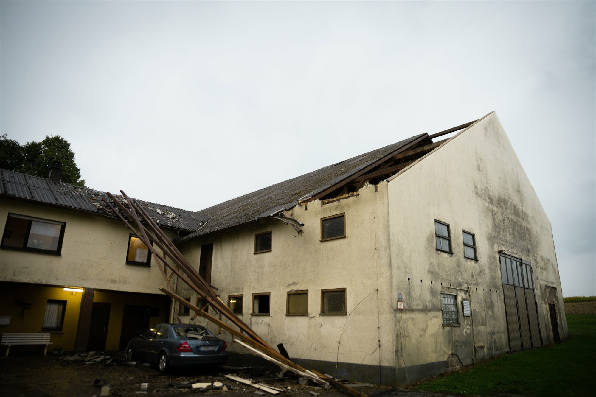 Hierbei wurden bei einer Scheune am Reinhildehof (Straße nach Niederweiler) ein Teil des Daches abgedeckt, Trümmer beschädigten einen PKW. Ebenso wurde in der Neubausiedlung ein weiteres Dach, das angrenzende Gartenhaus, ein Carport sowie das darin befindliche Fahrzeug beschädigt.
