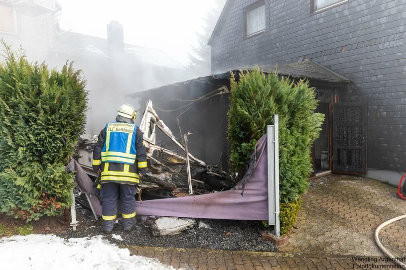 Beltheim. Am Montagnachmittag, 10. Januar, kam es zu einem Brand in der Lehnenstraße in Beltheim. Ein Wohnwagen, ein Schuppen und ein Carport wurden Opfer der Flammen. Die Bewohner des Hauses wurden nicht verletzt. Durch das Feuer wurde allerdings die Fassade des angrenzenden Wohnhauses in Mitleidenschaft gezogen. Die Brandursache steht noch nicht fest. Erste Einschätzungen der Polizei beziffern den Sachschaden auf rund 40 000 Euro. Im Einsatz waren die Feuerwehren Beltheim und Kastellaun, die Polizei und das DRK.