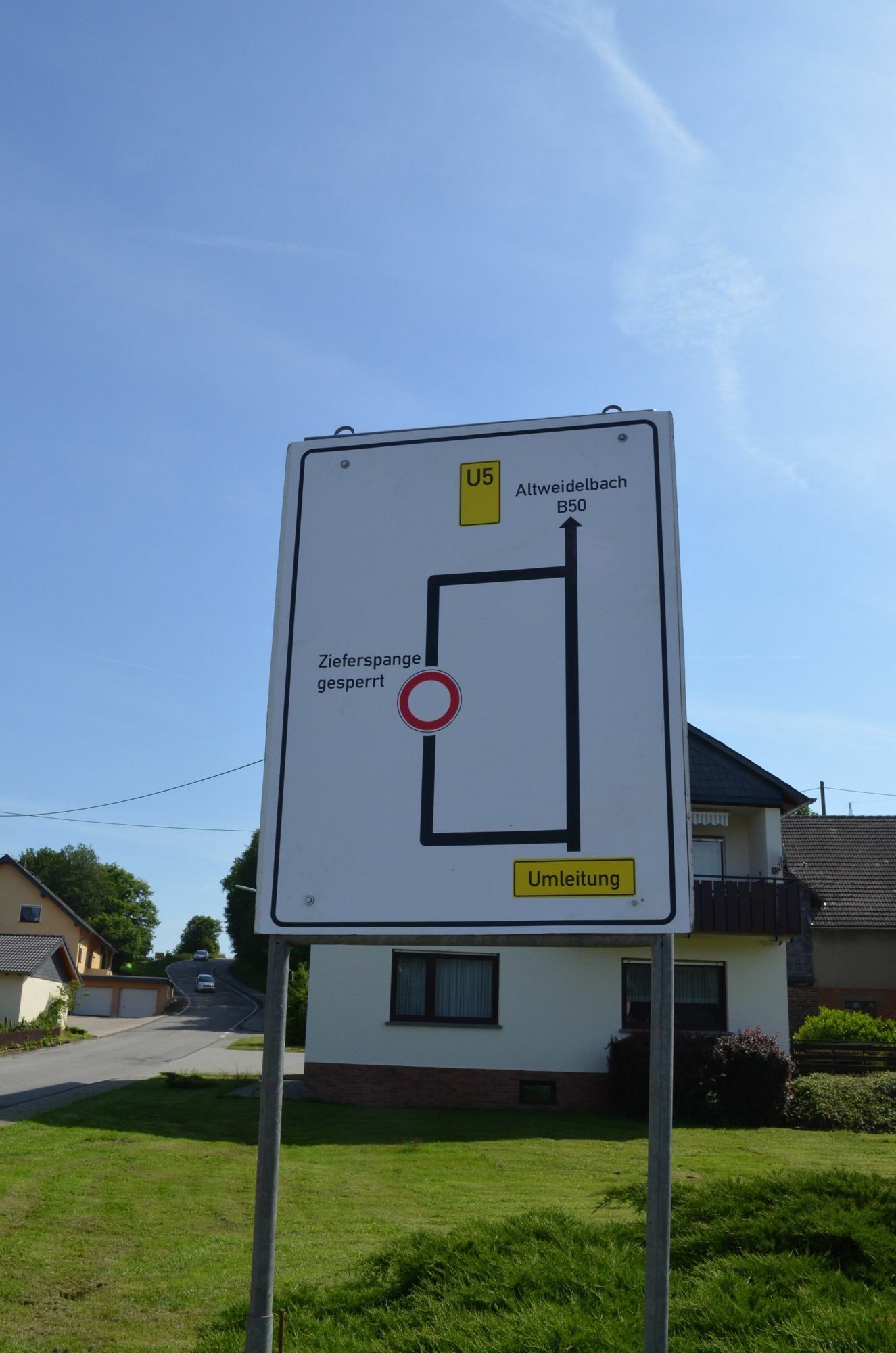 Es wird viele Autofahrer betreffen, die nach und in Simmern unterwegs sind: Ab Monatg, 28. Mai, beginnen die Sanierungsarbeiten an der sogenannten Zieferspange. Die Straße zwischen den beiden Kreiseln an der Stadteinfahrt aus Richtung Laubach kommend (Koblenzer Straße) und dem Wohngebiet An der Domäne / Hinterer Rinderberg (Richtung Altweidelbach) wird dann für drei Wochen für den Verkehr gesperrt. Die Umleitung soll die Autofahrer um die Stadt herum führen. Darauf weisen bereits die Schilder hin, die am Wochenende rund um Simmern aufgestellt wurden, wie in Kümbdchen (Foto).