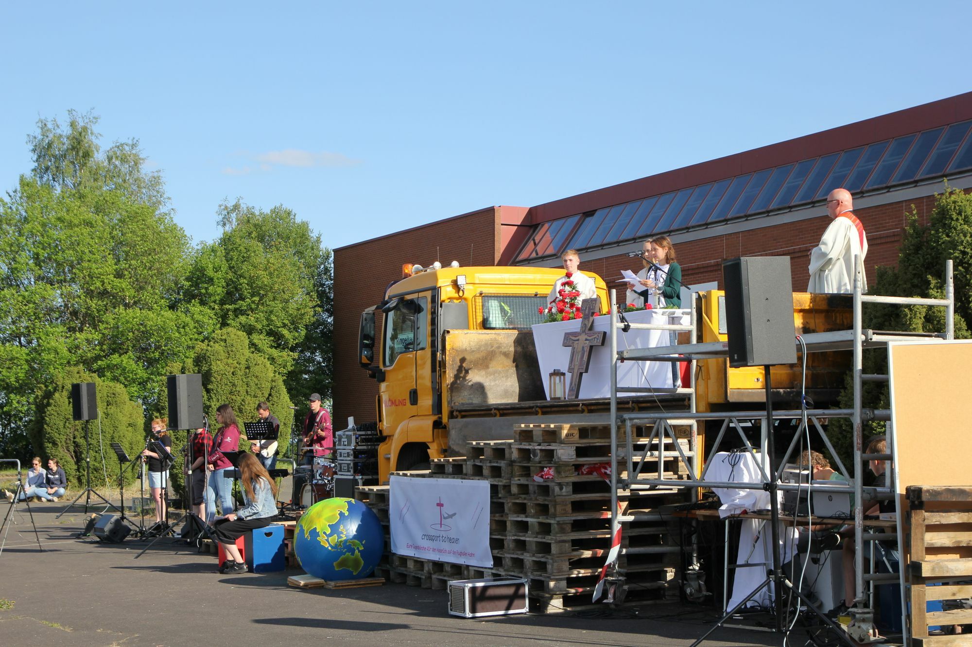 Vor der ehemaligen Ringeltaube konnte das Team von crossport to heaven erfolgreich zum ersten Mal eine solche Gottesdienstform umsetzen. Die Jugendlichen hatten neben den Inhalten auch die Live-Übertragung organisiert. Für den besseren Sound hatten sie besondere Unterstützung von T-Light Veranstaltungstechnik. Auch musikalisch hatten sie mit der Jugendband Changes endlich wieder eine Möglichkeit sich einzubringen. Sie griffen auf ihr altes Repertoire zurück, da sie ja so lange nicht proben konnten.