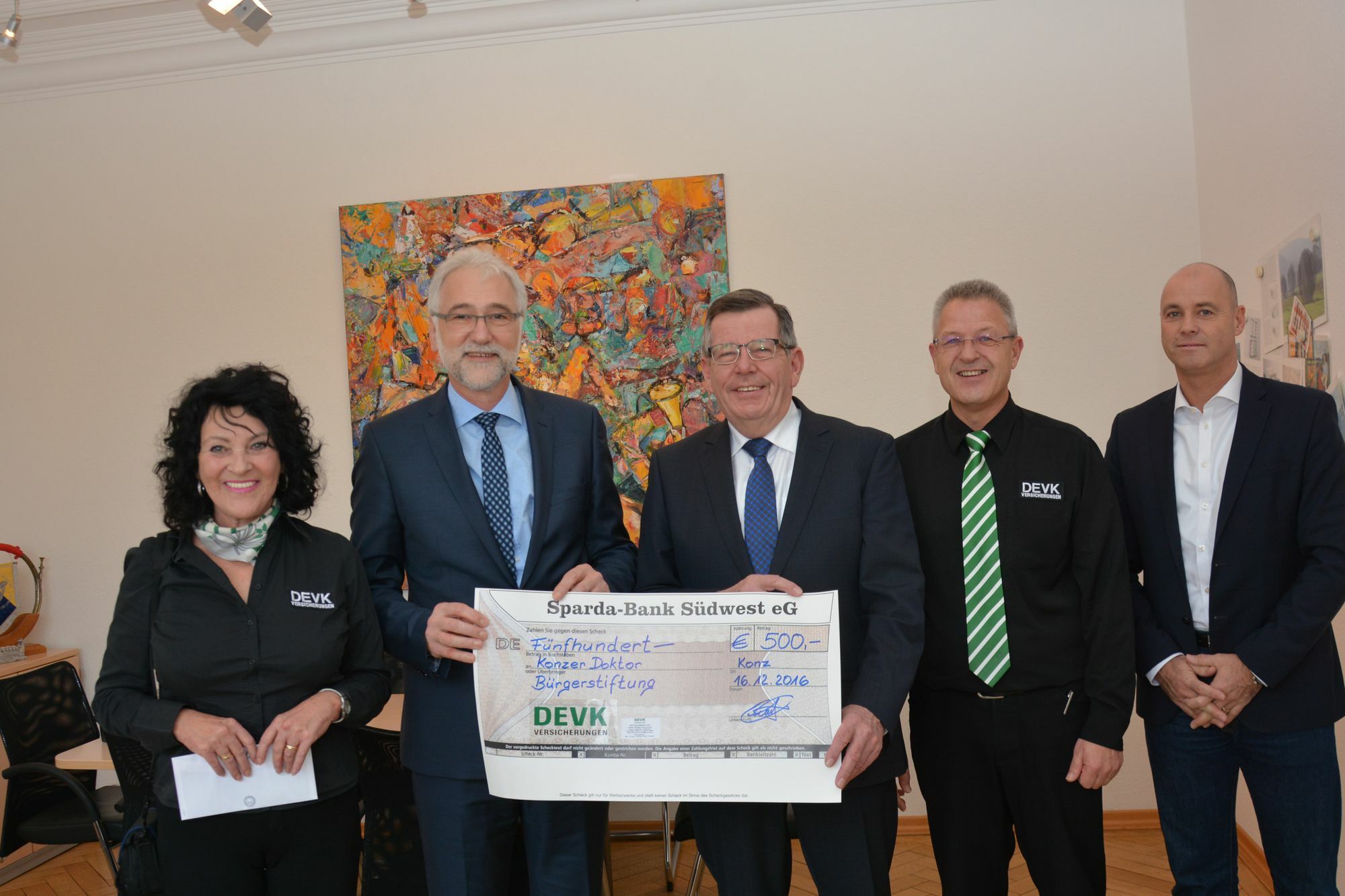 Zu einer Tradition ist es geworden, dass Lothar Schmitt, Leiter der Konzer DEVK-Geschäftsstelle, kurz vor Weihnachten eine Spende überreicht. In Begleitung seiner Frau Karin und dem Organisationsleiter der DEVK-Regionaldirektion Kai Becker überreichte er am 16. Dezember der Konzer-Doktor-Bürgerstiftung einen Scheck über 500 Euro. Bürgermeister und Stiftungsratvorsitzender Dr. Karl-Heinz Frieden und Mitglied des Stiftungsvorstands, Werner Dellwing, nahmen die Spende im Rathaus der Stadt Konz entgegen.