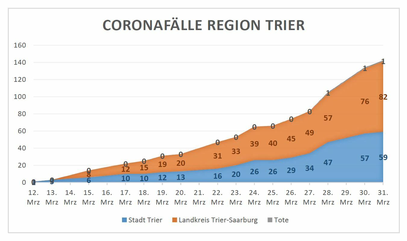 Damit erhöht sich die Zahl der bestätigten Fälle in der Stadt Trier auf 59. Im Landkreis Trier-Saarburg sind inzwischen 82 bestätigte Infektionen gemeldet. Insgesamt sieben Patienten aus Kreis und Stadt befinden sich in stationärer Behandlung im Corona-Gemeinschaftskrankenhaus in Trier. Inzwischen konnten 26 Quarantäneverfügungen vormals positiv getesteter Personen aufgehoben werden. Dabei handelt es sich um jeweils 13 Personen aus dem Landkreis und der Stadt Trier.