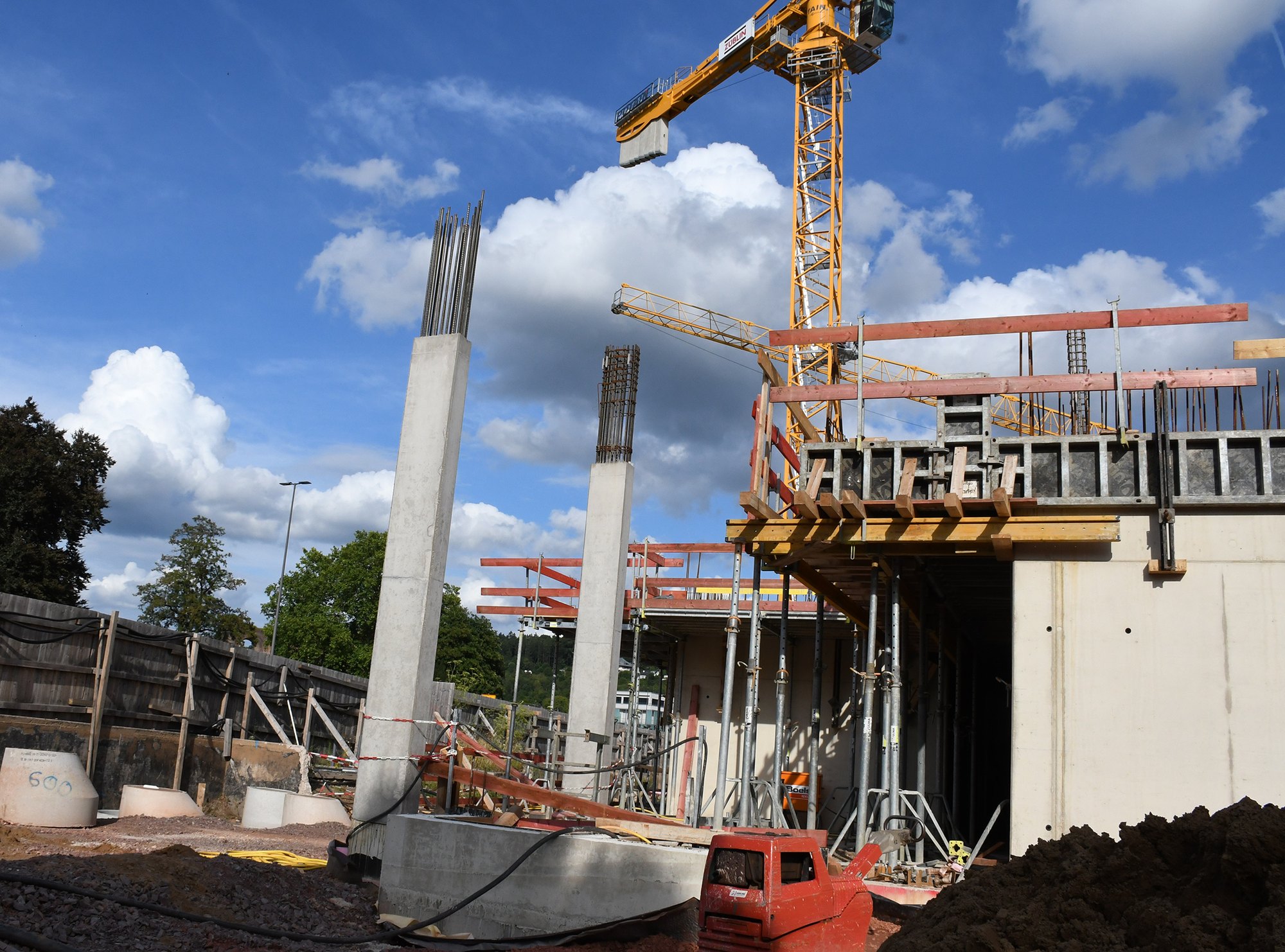 Das liegt vor allem an den bis zu 80 Zentimeter dicken Bodenplatten der beiden Untergeschosse und des Erdgeschosses, die die Last der beiden Gebäude für die Feuer- und Rettungswache mit Fahrzeughalle und für die Integrierte Leitstelle mit einer Grundfläche von insgesamt 5500 Quadratmetern tragen müssen. Der zuletzt eingezogene Boden des Erdgeschosses wird jetzt als Lagerfläche für Baumaterial aller Art genutzt.