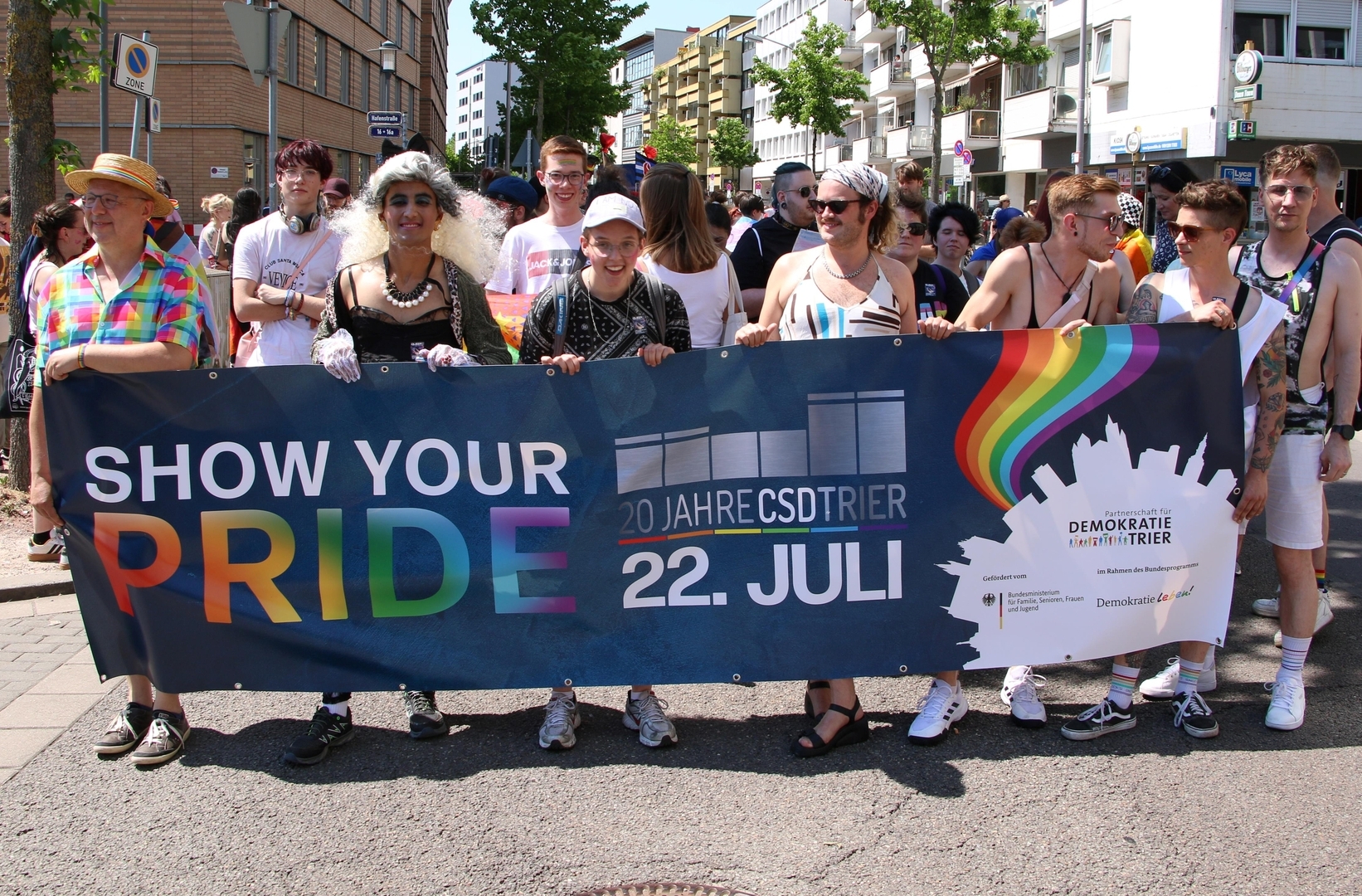 20 Jahre CSD heißt auch jahrelanger Kampf für queere Rechte. Aktuell verzeichnen sich leider vermehrt Angriffe und Hass auf queere Menschen im öffentlichen Raum und auf CSD-Veranstaltungen. Dem will sich der CSD Trier aktiv entgegenstellen und zeigen, dass queere Sichtbarkeit im Kampf um Akzeptanz und Gleichberechtigung weiterhin einen hohen Stellenwert haben muss. Der Christopher Street Day erinnert an den 28. Juni 1969, als sich Schwule, Lesben, Transsexuelle und Transgender-Personen in New York erstmals gemeinsam gegen staatliche Willkür und gewaltsame Übergriffe der Polizei zur Wehr setzten. Seither gehen alljährlich überall auf der Welt Menschen mit einer farbenfrohen Demonstration auf die Straßen.