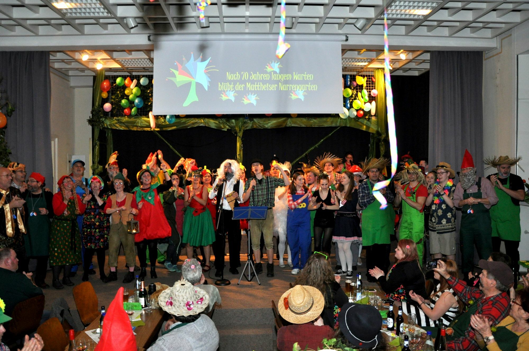 Sitzungspräsident Markus Köhnen zog mit seinem Organisatoren durch die jubelnden Gäste in den Saal, begrüßte "ein zauberhaftes Publikum" und stellte die Narren vor der Bühne galant auf einen unterhaltsamen Abend ein. Unzählige Latzhosen, Zwerge, Blumenkinder und Insekten folgten dem Leitsatz und stimmten die Kostümierung auf das vorgegebene Motto ab: 70 Jahre Mattheiser Kappensitzung bedeutet auch "70 Jahre Motto-Karneval". Den Besuchern wurde ein sechsstündiges Jubiläumsprogramm mit allerlei närrischen Büttenreden und karnevalistischen Tänzen geboten. So schwelgte Edgar Berg als Mattheiser Gartenzwerg in längst vergangenen Zeiten und stellt einige Momente und Personen der vergangenen 70 Jahre des Mattheiser Karnevals ins Rampenlicht. Mit einem großen und einem kleinen Instrument erzählen Tobias Schaffrath und Daniel Knopp wiederum in geistreichem Liedgut über ihre Gedanken an Karneval. Die Tanzgruppe "Chaos-Team" wirbelte mit atemberaubenden Tanzeinlagen und schnell wechselnder Performance den Saal richtig durcheinander. RED, Fotos: FF