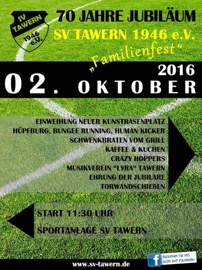 Die musikalische Umrahmung erfolgt durch den Musikverein "Lyra" Tawern. Pfarrer Bernhard Bollig übernimmt um 14 Uhr die Einsegnung des neuen Kunstrasens. Um 15 Uhr ertönt der Anpfiff des Meisterschaftsspiels der ersten Mannschaft in der Kreisliga B gegen die Spielvereinigung Trier. In der Halbzeit gibt es eine Tanzeinlage der "Crazy Hoppers Teens". Ab 17 Uhr messen sich die Vereine der Ortsgemeinde im Dorf-Torwandschießen.