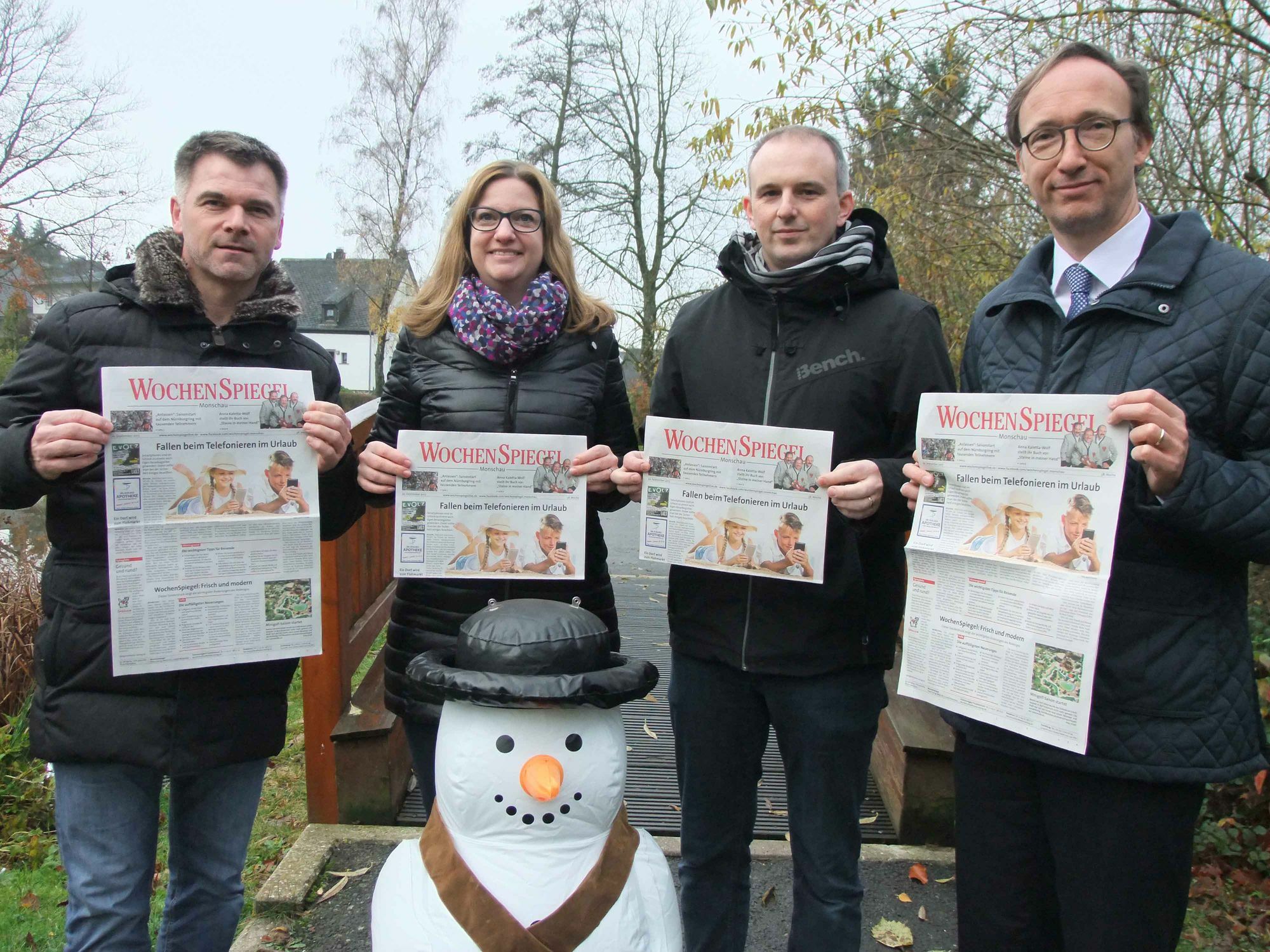 "Der WochenSpiegel spricht uns jetzt noch mehr an als früher. Die Seiten sind klarer, moderner und transparenter gestaltet. Informationen aus der Heimat werden hierdurch noch deutlicher hervorgebracht. Die neue Aufmachung ist mehr als gelungen." - Dieter Nels, Stefanie Schömer, Markus Weicherding und Christian Kruchten (von links) vom Hochwald Gewerbe Verband (HGV). Foto: Fischer
