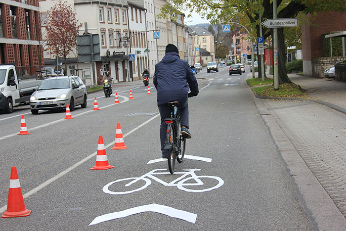 Wie Jonas Klöpfer, Koordinator für den Fahrradverkehr im Stadtplanungsamt, erläuterte, wurden mit der Metzer Allee, der Spitzmühle, der Walramsneustraße, der Trevirispassage, der Herzogenbuscher- und der Loebstraße seit 2010 wichtige Abschnitte der Trasse mit separaten Radwegen, Radfahrstreifen oder Umweltspuren für den Radverkehr fit gemacht. Für die Weberbach und die Paulinstraße, wo aus Platzgründen die Markierung eines Radfahrstreifens nicht möglich ist, wird in den kommenden Wochen ein innovatives Konzept umgesetzt: Piktogramme, die in regelmäßigen Abständen auf die Fahrbahn aufgebracht werden, signalisieren den Autofahrern, dass Radverkehr hier zu erwarten ist und auch erwünscht ist. Die Radfahrer selbst sollen so ermutigt werden, die Fahrbahn statt den Gehweg zu benutzen. Die Fahrradsymbole auf der Straße werden jeweils durch zwei Richtungspfeile ergänzt, die auf eine kontinuierliche Radroute hinweisen. Für das Aufbringen der insgesamt 61 Piktogramme auf einer Strecke von knapp 1,5 Kilometern wird mit Kosten von rund 15.000 Euro gerechnet. Sofern es keinen frühen Wintereinbruch mit Dauerfrost gibt, soll die Markierung noch 2017 abgeschlossen sein.