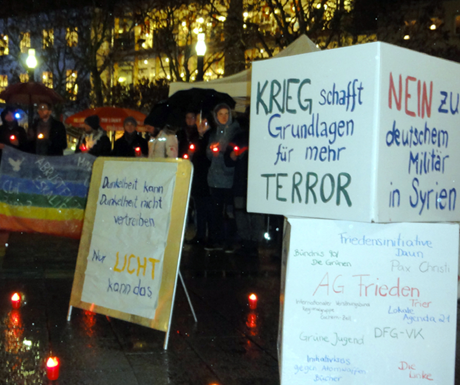 Markus Pflüger von der AG Frieden (AGF) erklärt: "Wir lehnen den Kriegseinsatz der Bundeswehr ab, er wird den Hass weiter schüren und den Terror des IS – auch bei uns – verstärken. Noch mehr Menschen werden zur Flucht gezwungen." Elf Gruppen hatten die Aktion der Arbeitsgemeinschaft Frieden unterstützt: Pax Christi Trier, Die Linke Trier, Bündnis 90/Die Grünen Trier, Initiativkreis gegen Atomwaffen Büchel, Lokale Agenda Trier, DFG-VK Trier, Friedensinitiative Daun, Grüne Jugend Trier, Internationaler Versöhnungsbund Regionalgruppe Cochem-Zell und attac. Auch syrische Flüchtlinge nahmen an der Friedensaktion gegen den Kriegseinsatz teil.