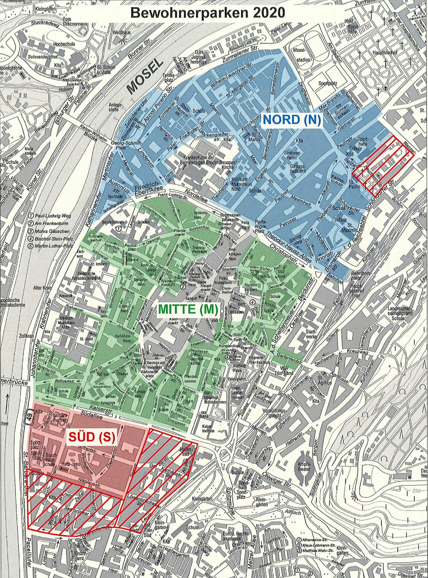 Die Zuteilung der einzelnen Straßen orientiert sich dabei größtenteils an den Grenzen der Ortsbezirke Trier-Nord, Mitte-Gartenfeld und Trier-Süd. Ausnahme ist das Quartier um die Merianstraße, das politisch zu Mitte-Gartenfeld gehört, beim Bewohnerparken aber der Zone Nord zugeteilt wird.