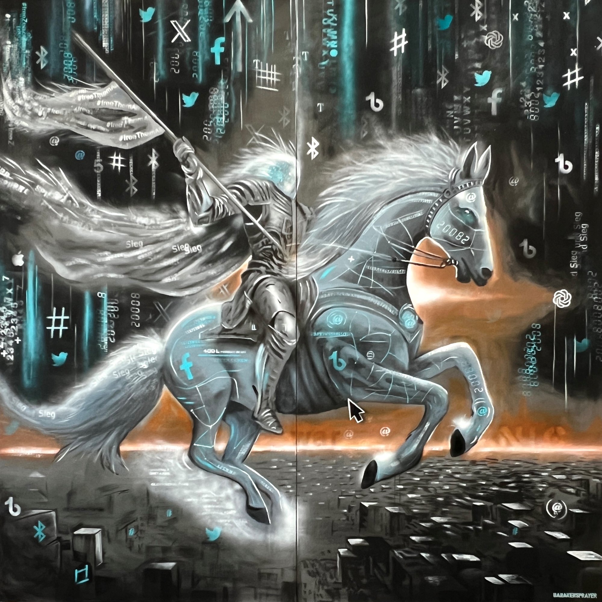 Anders bei Baumgärtel: Sein weißer Reiter symbolisiert, wie der Künstler sagt, die Ausbreitung von Ideologien und Einflusssphären durch politische, wirtschaftliche und digitale Mächte. Er stehe stellvertretend für die Gefahren der Künstlichen Intelligenz, zunehmende Digitalisierung und die Unterdrückung von Freiheitsrechten.