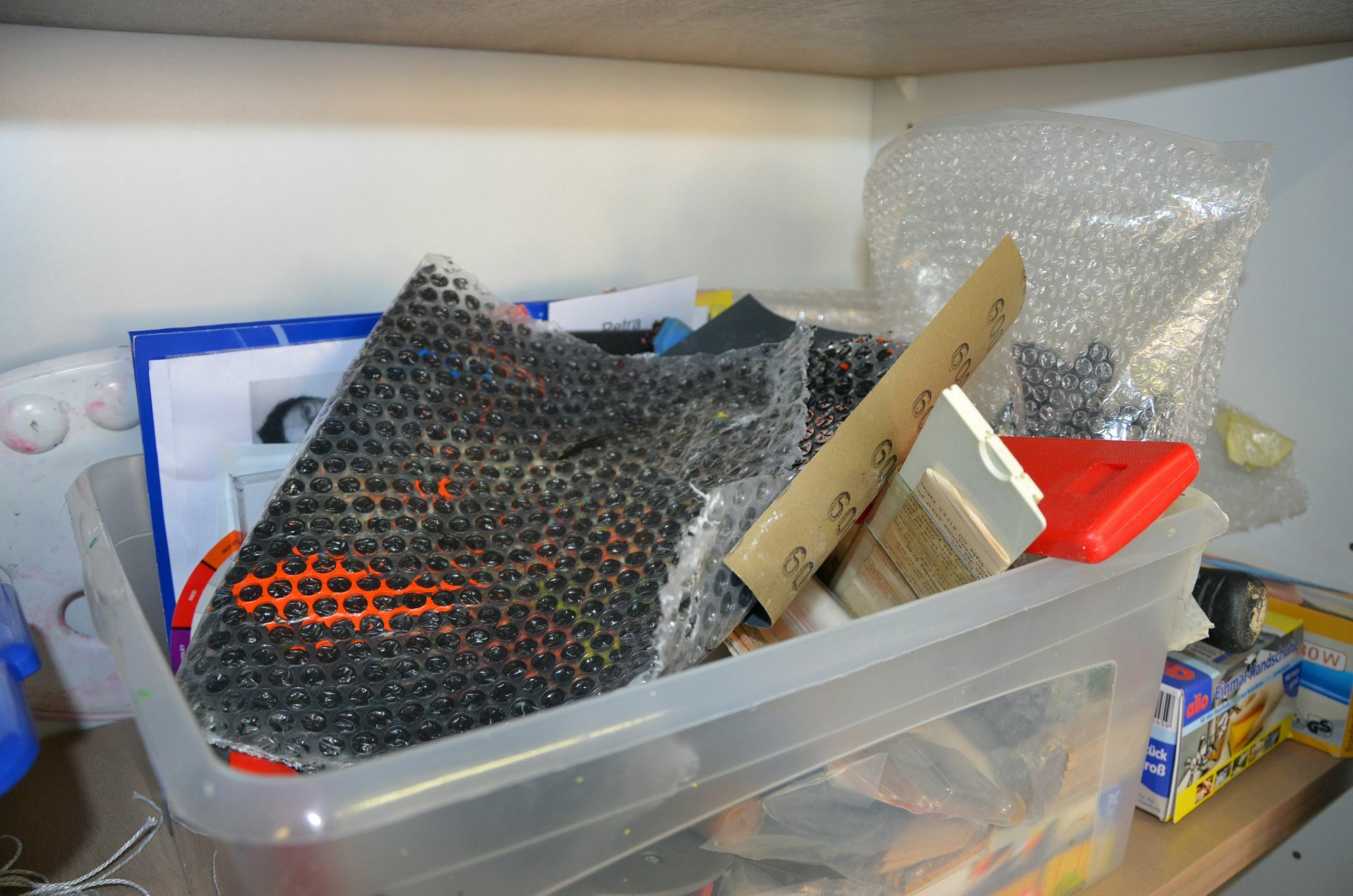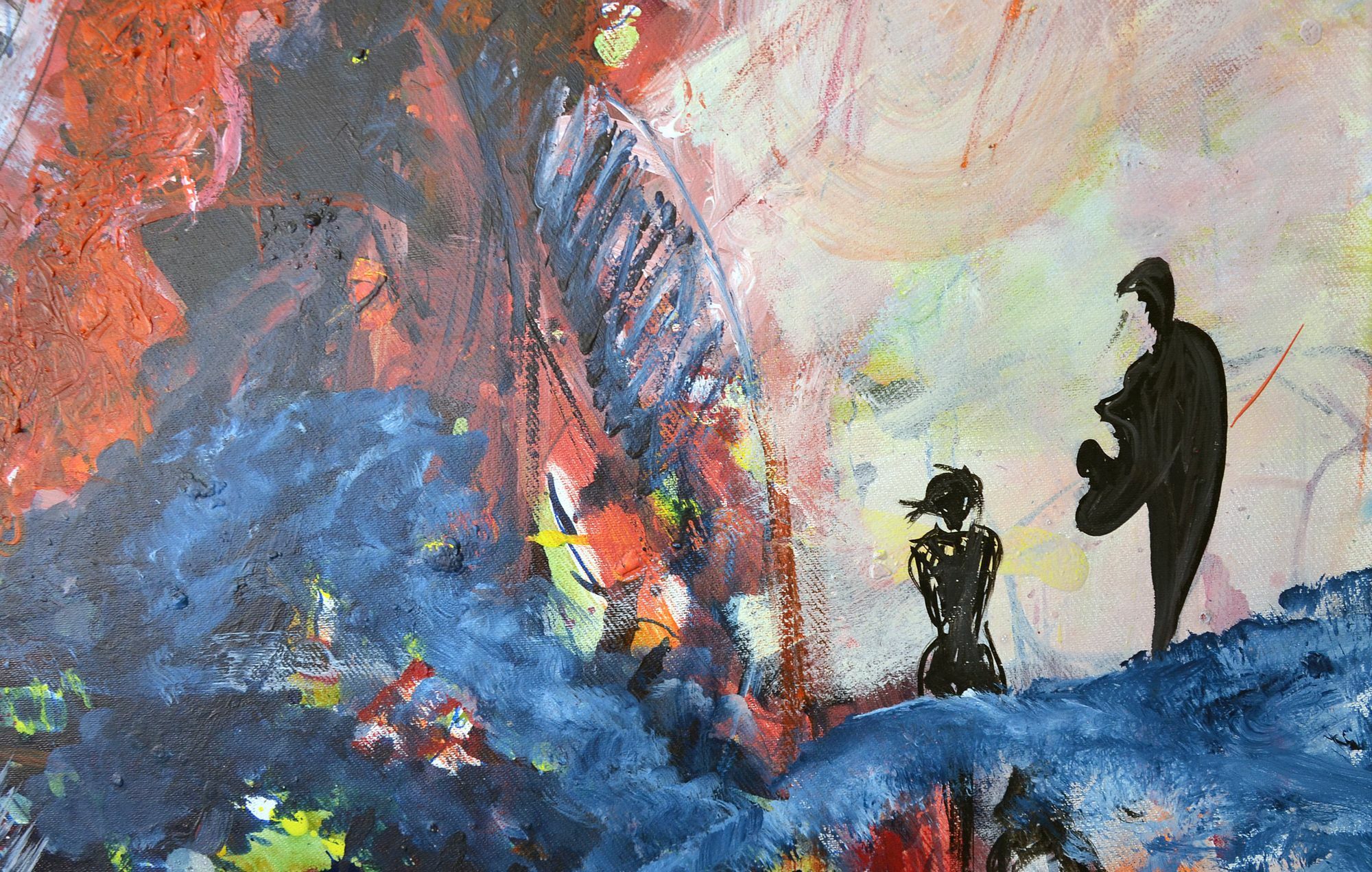 Ihr aktuelles Werk lässt ebenso genügend Spielraum für Gedanken. "Zuerst schrieb ich mit schwarzer Acrylfarbe ein Liebesgedicht von Christian Morgenstern auf die weiße Leinwand. Danach folgte ich meiner Intuition. Mir war nach teils knallbunten Farben und marginal figürlichen Zeichnungen zumute und dann war da noch das Luftpolsterpapier …", erzählt die Künstlerin und lächelt. Wie der Rhythmus des Gedichts einen Richtungswechsel einschlägt, so auch die angewandten Techniken und kontrastreichen Farben. Offenbar glauben unsere Augen sich selber, unsere Ohren anderen Menschen und unsere Intuition der Wahrheit. Es zeugt von einem Hochgefühl, sich selbst in seiner Leidenschaft zu verlieren und zu begegnen.