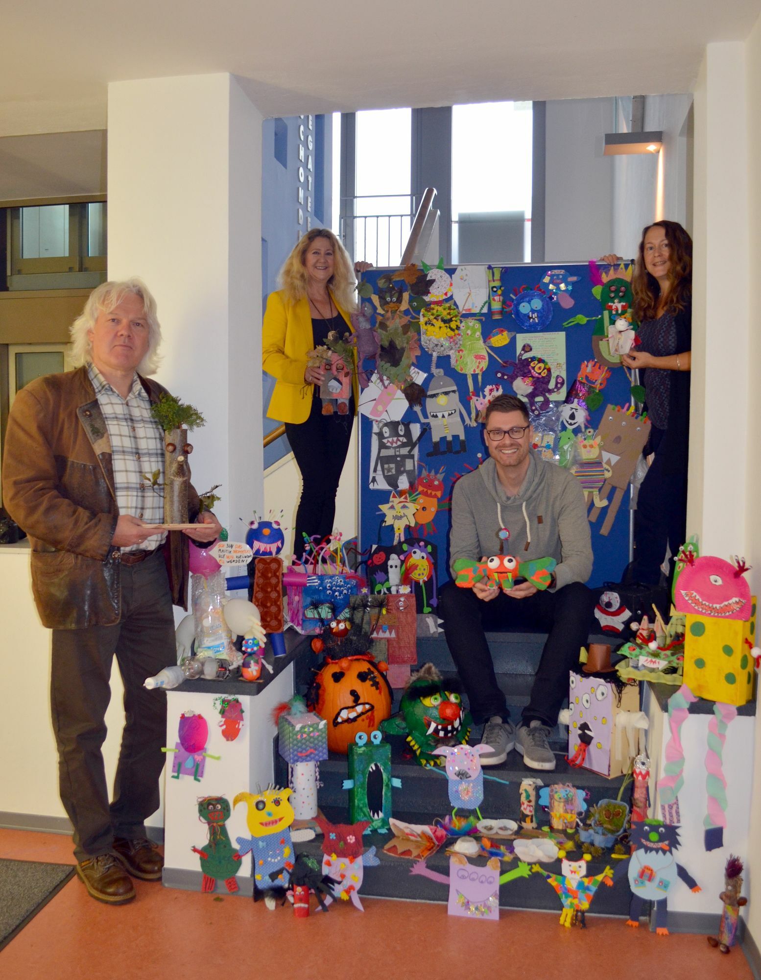 Welches gebastelte Mini-Monster ist das schönste? Eure WochenSpiegel Redaktion (v. l.: Arnt Finkenberg, Andrea Fischer, Jan Kreller, Claudia Neumann) kann sich gar nicht entscheiden. Deshalb haben wir für euch eine Internet-Galerie eingerichtet, in der ihr jetzt abstimmen könnt. Foto: Diederich