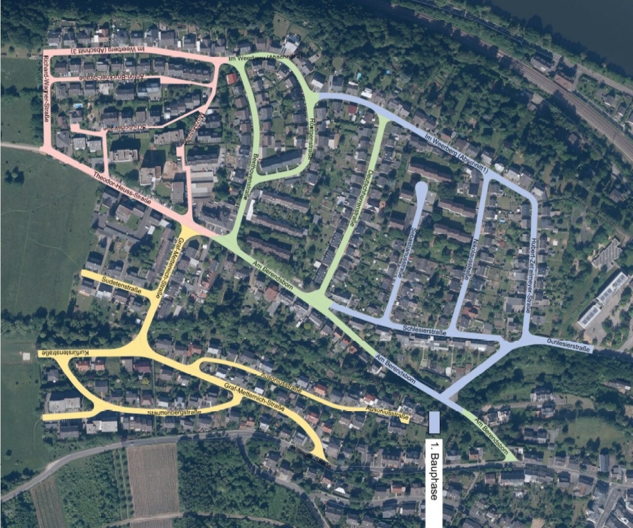 Inhalt des Ausbaukonzeptes war auch eine Empfehlung zur Unterteilung des Berendsborn in Bauphasen, die sich im Wesentlichen am Alter und Zustand der Straßen und Entwässerungsleitungen orientiert hat. Diese Bauphasen werden dann wiederum in sinnvolle Bauabschnitte unterteilt, die dann entsprechend als Bauaufträge nacheinander ausgeführt werden. Die nun zunächst anstehende 1. Bauphase betrifft die Straßen Hubert-Zettelmeyer-Straße, Nikolausstraße, Sebastianusstraße, Schlesierstraße sowie Im Weerberg (bis zur Röntgenstraße). Die im Rahmen dieser Bauphase ca. 220 betroffenen Grundstückseigentümer werden im Rahmen einer Bürgerinformationsveranstaltung am 7. Mai (um 19 Uhr in der Sporthalle St. Nikolaus, Schlesierstraße 36) informiert und haben damit die Möglichkeit sich zur Planung äußern.