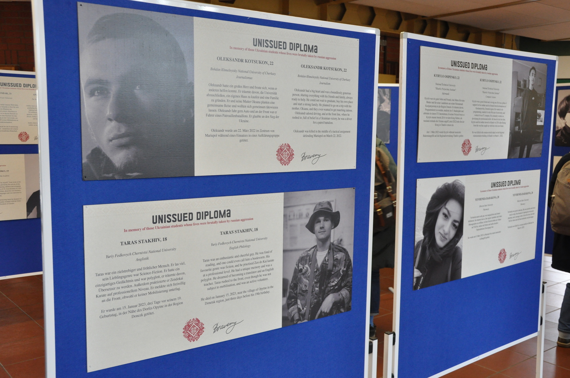 Auf Schautafeln werden Porträtfotos der durch den Krieg ums Leben gekommenen Studentinnen und Studenten gezeigt, ergänzt durch Informationen zu ihrer Person, ihren Hobbys, Träumen und ihren Lebensplänen. In den Texten werden auch die Umstände ihres Todes beschrieben. Die Ausstellung wurde bereits im vergangenen Jahr mit 36 Studierenden-Porträts an 110 Orten in 24 Ländern gezeigt, darunter an 67 Universitäten."Unissued Diplomas" wird vier Wochen lang im Foyer des Mensagebäudes der Universität Trier zu den üblichen Öffnungszeiten zu sehen sein. Die Ausstellung wird mit Unterstützung von Universitätspräsidentin Prof. Dr. Eva Martha Eckkrammer vom AStA der Universität und der Deutsch-Ukrainischen Gesellschaft Trier organisiert und im Anschluss weiteren Universitäten und Hochschulen zur Verfügung gestellt.