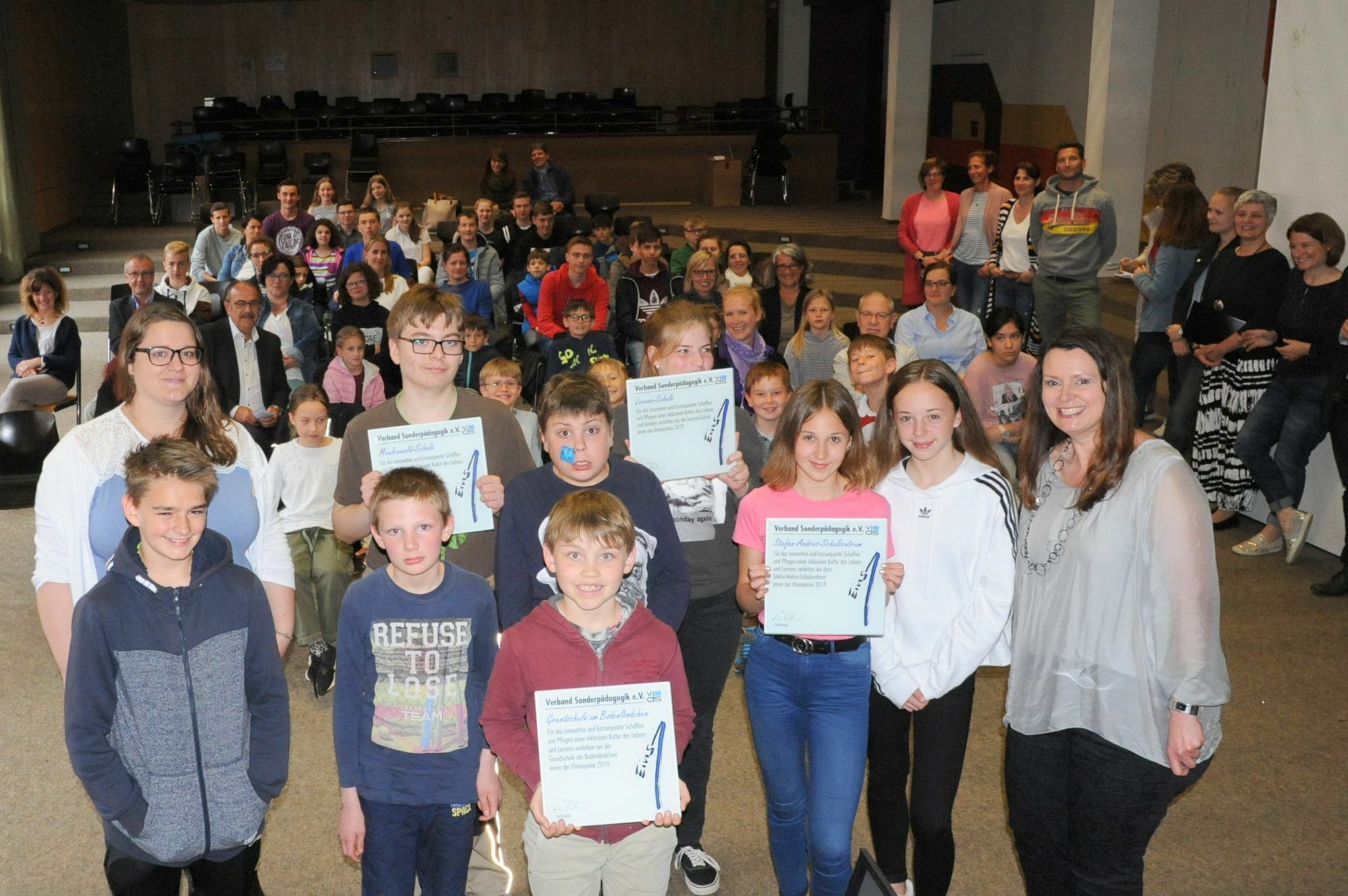Der Verband für Sonderpädagogik (vds), eine Interessenvertretung für Menschen, die Unterstützung benötigen, würdigt das mit seinem Ehrenpreis "EINS werden – EINS sein". Jede Schule wird ausgezeichnet "für das innovative und konsequente Schaffen und Pflegen einer inklusiven Kultur des Lebens und Lernen". Die Plaketten überreichten Anne Trinkaus und Martina Lummel-Deuschle vom Landesverband an Schüler, die sie stolz entgegen nahmen. Grundschülerin Yara bedankte sich bei den Lehrern, "die sich sowas Schönes ausgedacht haben". Für Katharina war es ihre erste Ski-Freizeit. Dass sie dort "mit vielen anderen" in nur einer Woche das Skifahren erlernte, hätte sie nicht gedacht. Yannic war zum zweiten Mal dabei. Es sei schön, andere Leute kennen lernen zu können. Schüler des Schulzentrums freuten sich über viele Unternehmungen und die Chance, mit Schülern anderer Schulen etwas zusammen machen zu können. So hätten sie gelernt, gut miteinander auszukommen.