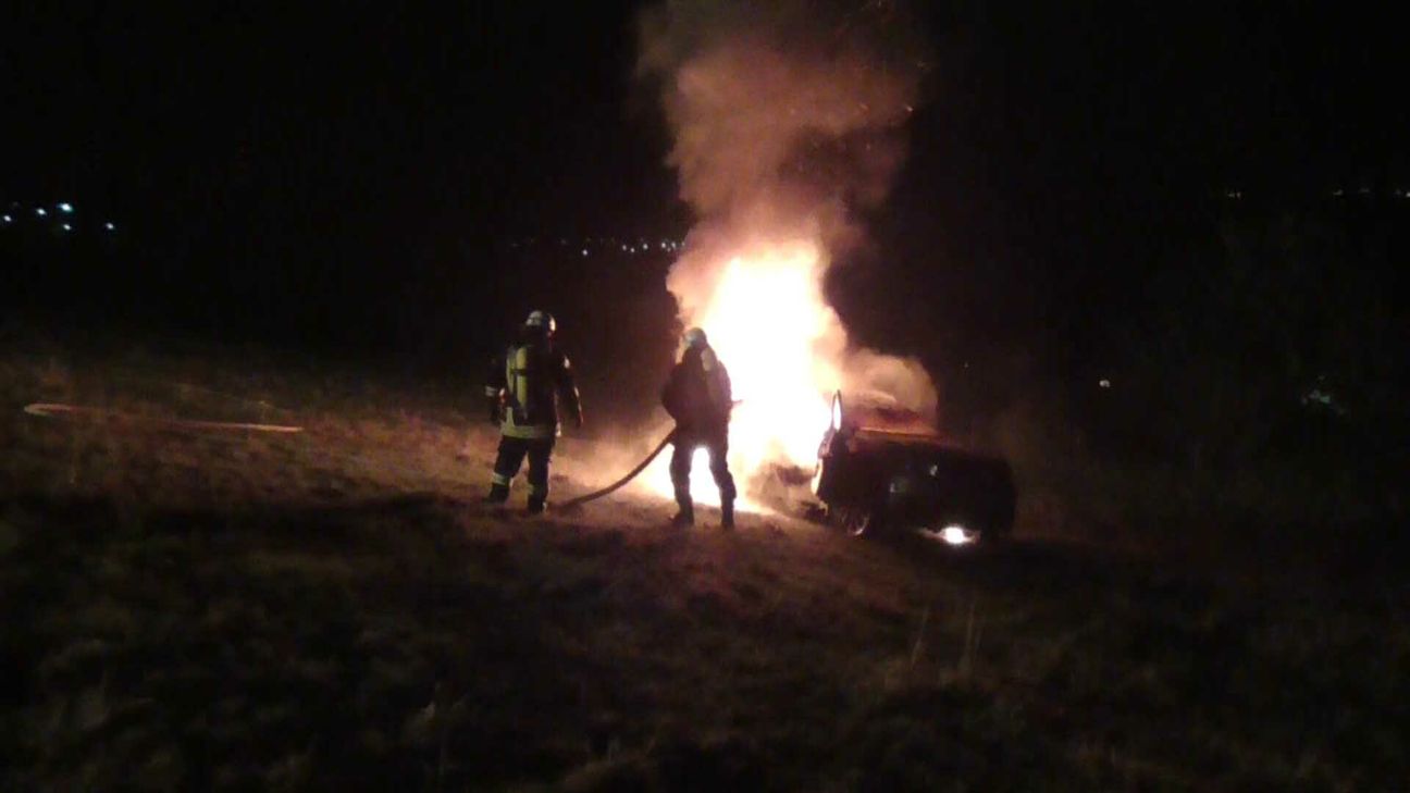 Noch während die Feuerwehr unterwegs war, machte sich das brennende Auto selbstständig und rollte los. Dabei rammt es das Fahrzeug des Helfers, kam von der Straße ab, durchbrach einen Weidezaun und rollte etwa 200 Meter den Hang hinab. Vor mehreren Bäumen und Hecken kam das Auto schließlich zum Stehen.