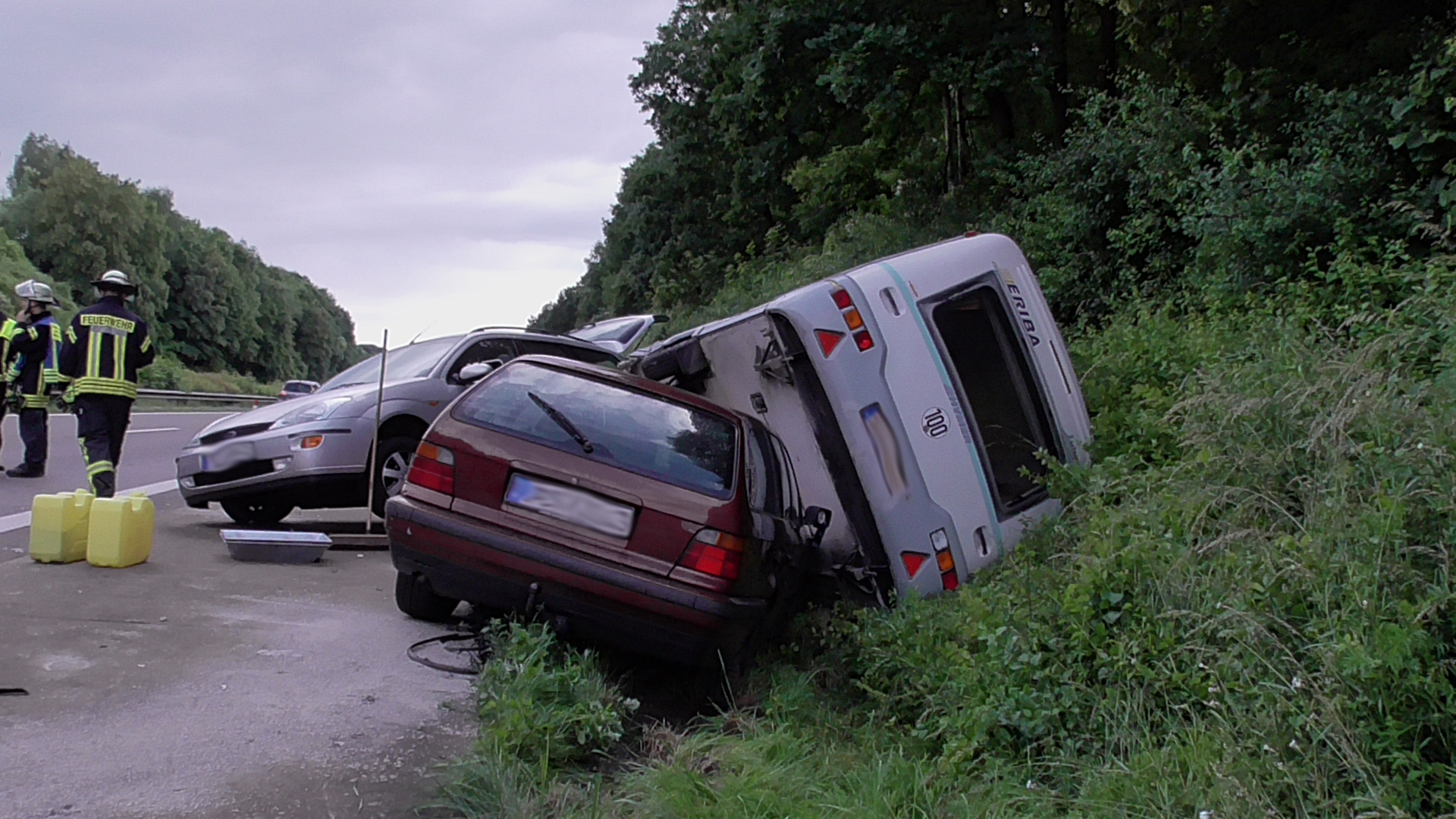 Die Unfallverursacherin und zwei Kinder wurden bei dem Aufprall leicht verletzt. Nach notärztlicher Erstversorgung kamen diese in ein Krankenhaus . Die Feuerwehr sicherte die Unfallstelle einspurig ab und streute die auslaufenden Betriebsstoffe auf der Autobahn ab. An den Autos und dem Wohnanhänger entstand erheblicher Sachschaden. Der Verkehr wurde an der Unfallstelle vorbei geleitet, es kam zu kleineren Behinderungen.