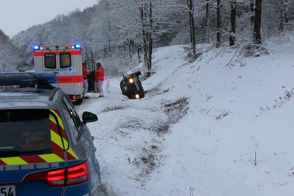 Die 21-Jährige aus der hiesigen war aus Richtung Schweich in Richtung Hetzerath unterwegs. Auf einer leichten Steigung kam sie vermutlich aufgrund nicht angepasster Geschwindigkeit auf schneebedeckter Straße nach rechts von der Fahrbahn ab. Das Fahrzeug überschlug sich und blieb im Graben auf der Seite liegen. Die junge Fahrerin wurde dabei leicht verletzt. Ein einjähriges Kind blieb unverletzt. Dank aufmerksamer und hilfsbereiter Verkehrsteilnehmer konnten die Frau und ihr Kind noch vor Eintreffen der Rettungskräfte aus dem Fahrzeug befreit werden. Mutter und Kind wurden zur Untersuchung in ein Krankenhaus nach Trier gebracht. Ein Notarzt und ein Rettungswagen waren am Unfallort im Einsatz. RED, Foto: Polizei