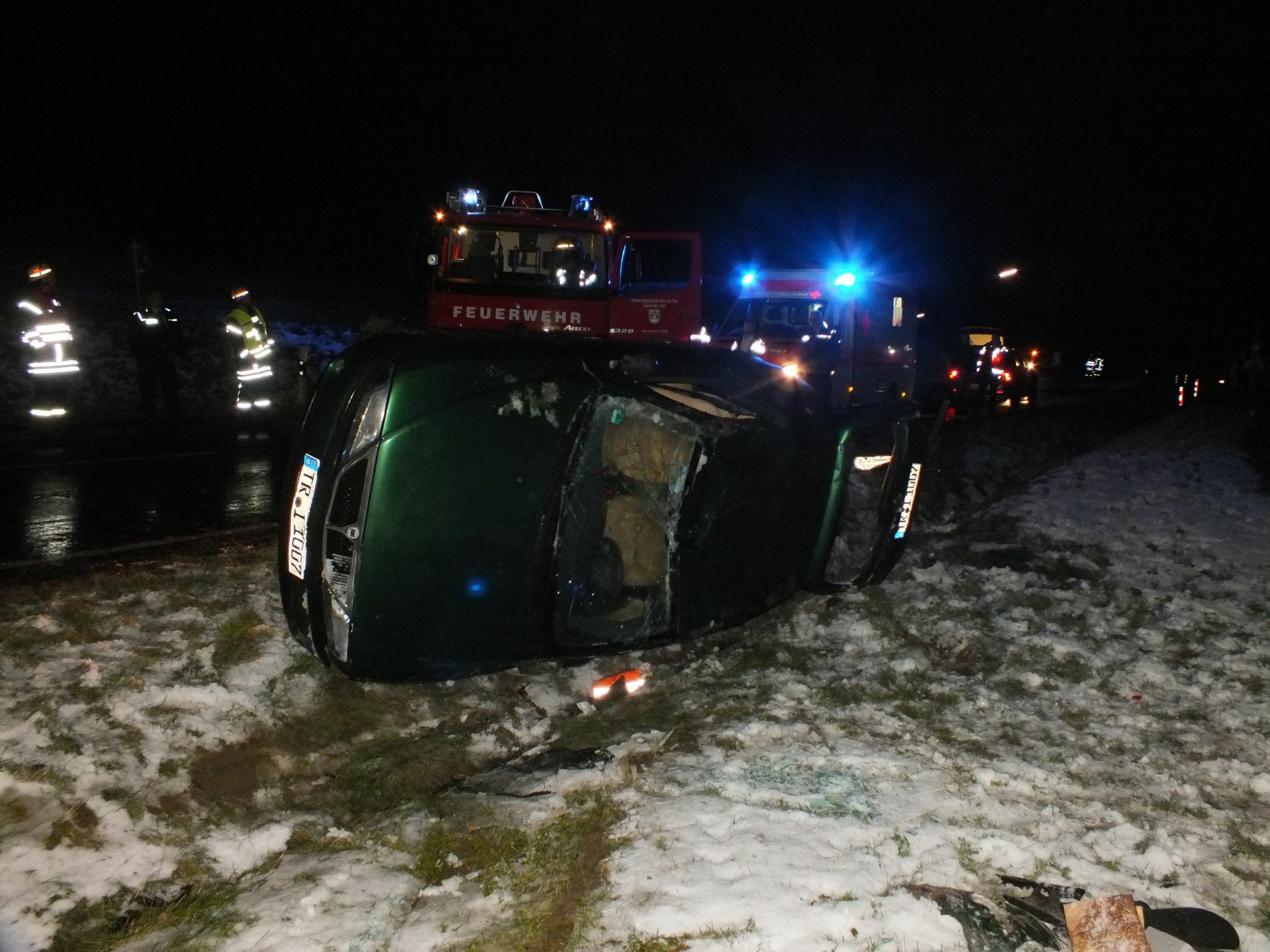 Vermutlich wegen starker Glätte, ist am Dienstagabend gegen 19 Uhr ein Auto nahe Zerf ins Schleudern geraten. Das Auto kam von der Fahrbahn ab fuhr über ein Ortseingangsschild und überschlug sich. Das Fahrzeug bleib auf einem Feld neben der Straße auf dem Dach liegen.
