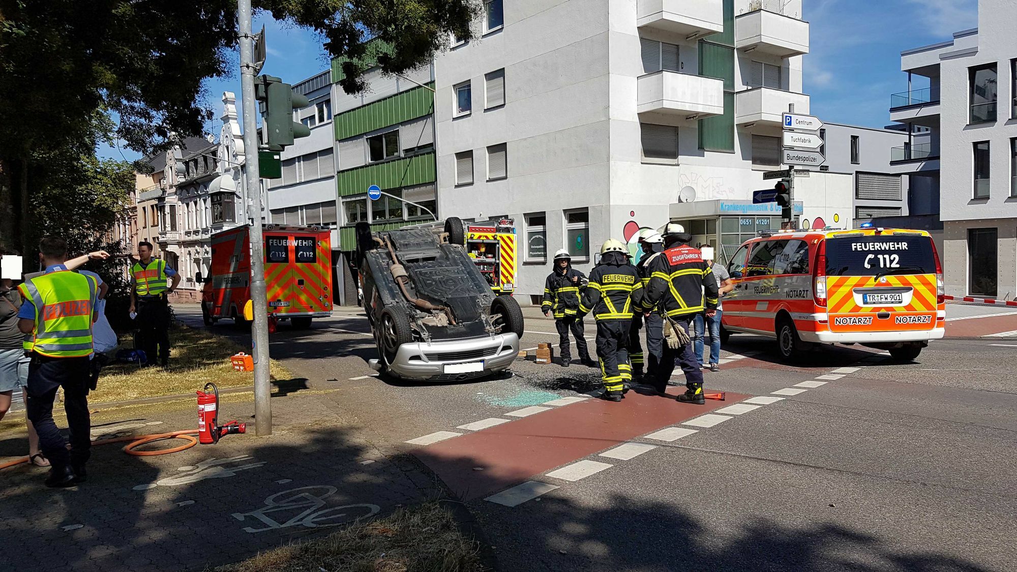 Ein Fahrzeug hat sich dabei überschlagen. Zwei Menschen wurden verletzt, laut Feuerwehr aber nicht lebensgefährlich. Die Kaiserstraße ist wegen der Bergungsarbeiten gesperrt. Es kommt derzeit zu langen Rückstaus.