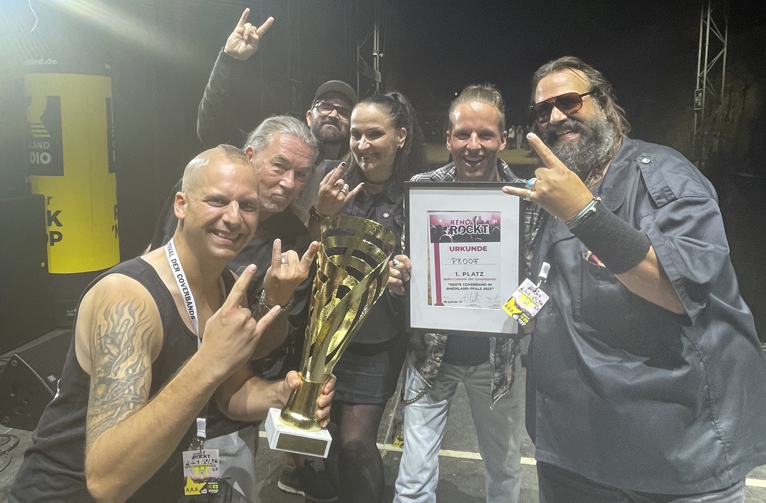 "Proof" wurden zur besten Coverband von Rheinland-Pfalz 2023 gewählt und räumten den 1. Platz ab. Die im Jahr 2008 gegründete sechsköpfige Band (bestehend aus Michael Göden, Stefan Görgen, Nico Hagemann, Christoph Lorenz, Dirk Lorenz, Viola Mencher) konnte ihr Glück gar nicht fassen und freut sich sehr über ihren Sieg und den Gewinn eines großen Live-Konzertes im nächsten Jahr.