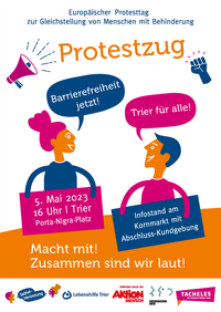 Der Protesttag ist ein Aufruf an alle Bürgern, aktiv zu werden und Menschen mit Behinderung dabei zu unterstützen, sich für ihre Rechte einzusetzen. Start ist um 16 Uhr mit einer Kundgebung an der Porta Nigra von Herrn Reppich, Vorstand des Lebenshilfe Trier. Dann beginnt die Demo: Der Protestzug geht über den Hauptmarkt durch die Grabenstraße in die Brotstraße und weiter über die Nagelstaße in die Fleischstraße. Der Marsch endet auf der Höhe des Kornmarktes in der Fleischstraße. Dort gibt es dann am Aktionsstand des Projekts eine Abschlusskundgebung mit dem Behindertenbeauftragten der Stadt Trier, Gerd Dahm. Im Anschluss folgen Reden von Selbstvertretern.