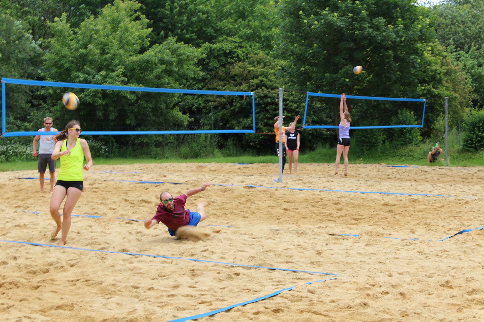 Mit viel Skepsis startete man ins Turnier, den 11. VVR-Beach-Cup Trier am 19. Juni. Trotz der widrigen Umstände und der fehlenden Möglichkeiten, das Turnier im Vorfeld vorzubereiten (Pavillons aufzubauen...), wurde es ein schöner Tag mit viel Sonne. Der Regen hatte sich komplett verzogen, so dass es von der Witterung zur Durchführung des Turniers hätte nicht besser sein können. 15 wackere Mannschaften nahmen nach einigen kurzfristigen An- und Abmeldungen teil. Auf 3 Feldern wurde in der Vorrunde in 3 Gruppen mit 5 Mannschaften gespielt, also genug Spiele, um sich in der Vorrunde ausgiebig auszutoben. In die Zwischenrunde gelangten aus jeder Gruppe die besten zwei Mannschaften, die übrigen Mannschaften spielten die Plätze 7-11 bzw. Plätze 12-15 aus.