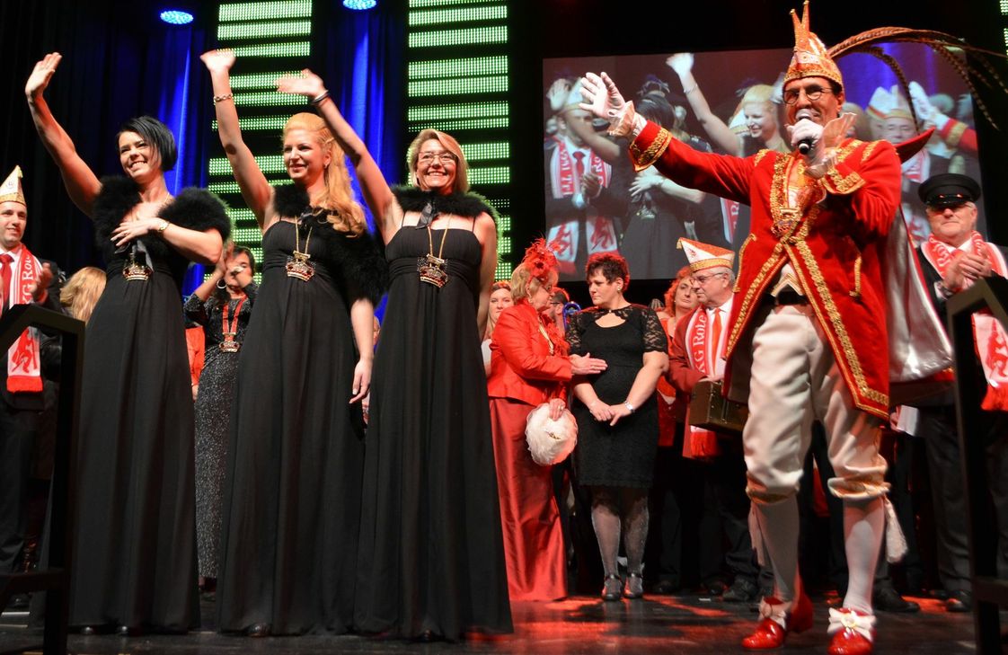 Noch voller wurde es auf der Bühne zur Inthronisation des Prinzenpaares 2016 mit Garden des Heimatvereins des Prinzenpaares, der KG Rote Funken, dem neuen Hofstaat und allen Aktiven. Der frisch inthronisierte Stadtprinz Elmar I. wies unter anderem darauf hin, dass das Prinzenpaar für Büttenredner-Nachwuchs einen eigenen Wettbewerb ausgeschrieben habe. Informationen dazu gebe es auf der Prinzen-Internetseite. Neben einem Geldpreis erwarte den Gewinner auch ein Auftritt mit seiner Büttenrede auf dem Neujahrsempfang der ATK. Erste Orden des Stadtprinzen 2016 gab es unter anderem für OB Leibe und Ministerpräsidentin Malu Dreyer. Danach folgte der protokollgemäße Präsentiermarsch mit Abschreiten der Garde.