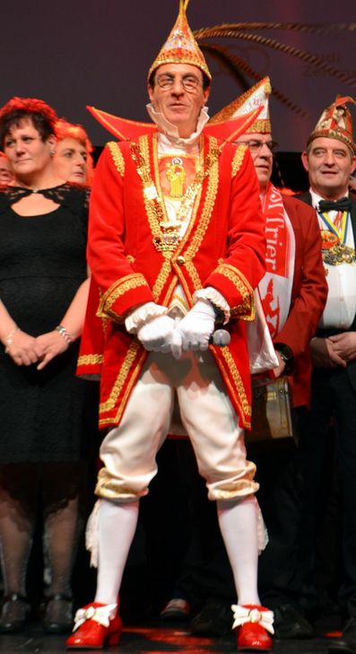 Günther Jauch kontert gekonnt: „Der Autist lebt und grüßt Trier“. Für ihn sei es der erste Orden, den er in seinem Leben bekomme. In den folgenden Minuten erfahren die 1000 Galabesucher nicht nur: Jauchs Ur-Ur-Ur-Ur-Großvater (viermal Ur!) Emmerich Grach hat einst die Geburtsurkunde von Karl Marx unterschrieben. Ur-Ur-Großtante Weißebach des Moderators Jauch gründet einst den Elisabethverein, aus dem später deutschlandweit die Caritas hervorging. Und auch sein Urgroßonkel, Franz Weißebach, ist den Trierer Insidern nicht unbekannt. Lebenslang ein gut situierter Privatier, stiftete er Trier drei Fuder Wein zum Bau eines Krematoriums. Erst wenn der Stadtrat fünf Jahre in Folge diesen Bau ablehne, dürfe man über den Wein verfügen. Im katholischen Trier wurde bekanntlich kein Krematorium errichtet. Mit dem Geld wurde später der Palastgarten gebaut. Jauchs Kommentar: „Drei Fuder Wein reichen heute für den Bau eines Tiefgaragenstellplatz in Olewig“. Nach Ahnenforschung im Publikum - bei seinen Sendungen tauchen neuerdings immer Menschen auf, die mit ihm verwandt sein wollen -, versprach er nach Ende seiner Polittalkshow Ende November in der ARD: Sie sehen mich künftig immer öfter hier. Ich bin ab dem Jahreswechsel viel mehr in der Region!“, was mit tobendem Applaus im Saal begrüßt wurde. In den Familienwortschatz Jauchs wird das Wort „Ausmarsch“, jedem Karnevalisten seit Kindesbeinen vertraut, neu aufgenommen. Jauch kannte es bisher nicht. Es gebe hunderte