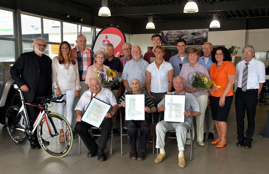 Der Vorsitzende des Vereins, Günter Steffgen, erläuterte die Verdienste des Trios: Josef Kittel war seit dem Zweiten Weltkrieg aktiv als Leichtathlet und Rad-Breitensportler. Zudem trat er immer wieder als Förderer in Erscheinung. In den 70er und 80er Jahren organisierte Kittel zudem das beliebte Moseluferradeln. Gerhardt Engel brachte den Radrennsport in der Region in den 70er und 80er Jahren groß heraus. Von Bezirks- über Rheinland-Pfalz-Meisterschaften bis zu einer Deutschen Meisterschaft organisierte er über fast zwei Jahrzehnte gemeinsam mit Günter Steffgen ein Event nach dem anderen. Außerdem war er über 20 Jahre lang Leiter der Abteilung Rennsport bei der Schwalbe. Manfred Reuland kam als Flugsportler in den 80er Jahren zu Schwalbe Trier, um sich mit Radwandern fit zu halten. Schnell rückte er als Organisationstalent in den Führungszirkel des Vereins und übernahm, als Not am Mann war, die Vereinsführung. Reuland machte sich verdient in der deutsch-luxemburgischen Sportbeziehung. Zum 60-jährigen Vereinsjubiläum gelang es Reuland im Rahmen einer Rennradausstellung, den legendären Radrennfahrer und Tour de France Gewinner Charly Gaul in Trier zu präsentieren.++