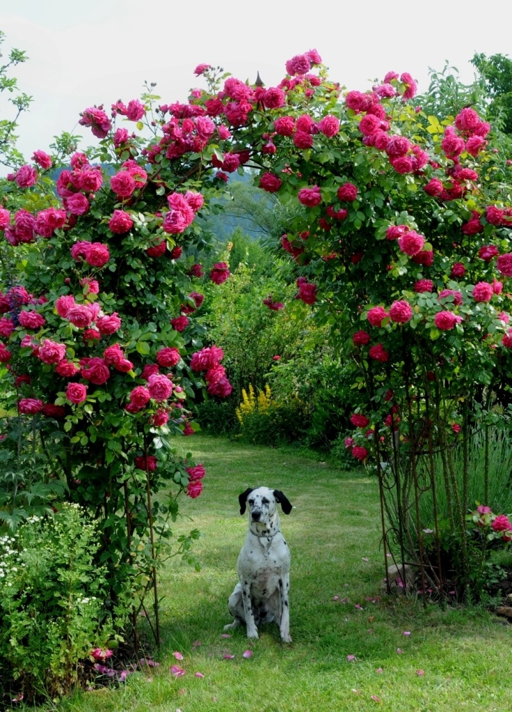 Familie Götte, St.-Kunibert-Platz 2: Malerische Pergola und Bögen mit Rambler-, Busch-, Strauch- und Kletterrosen, Skulpturen und Sinnspruch-Tafeln.