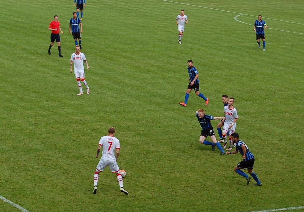 Gut gemacht, Eintracht! Im Freundschaftsspiel trotzte der Südwest-Regionalligist dem drei Klassen höher angesiedelten Bundesligisten 1. FC Köln am Donnerstag Nachmittag ein 2:2 ab. Dabei egalisierte das Team von Trainer Peter Rubeck einen 0:2-Rückstand: In der stärksten Phase der ohne den terminlich verhinderten Cheftrainer Peter Stöger (ihn vertrat „Co“ Manfred Schmid) und nur mit 15 Akteuren (davon drei Tormänner) angereisten Geißbock-Elf verwandelte Kevin Vogt in der 41. Minute zunächst einen von SVE-Kapitän Michael Dingels an Loureiro Bittencourt verwirkten Elfmeter. Kurz vor dem Halbzeitpfiff schloss Bittencourt einen Konter zum 0:2 ab (45.).