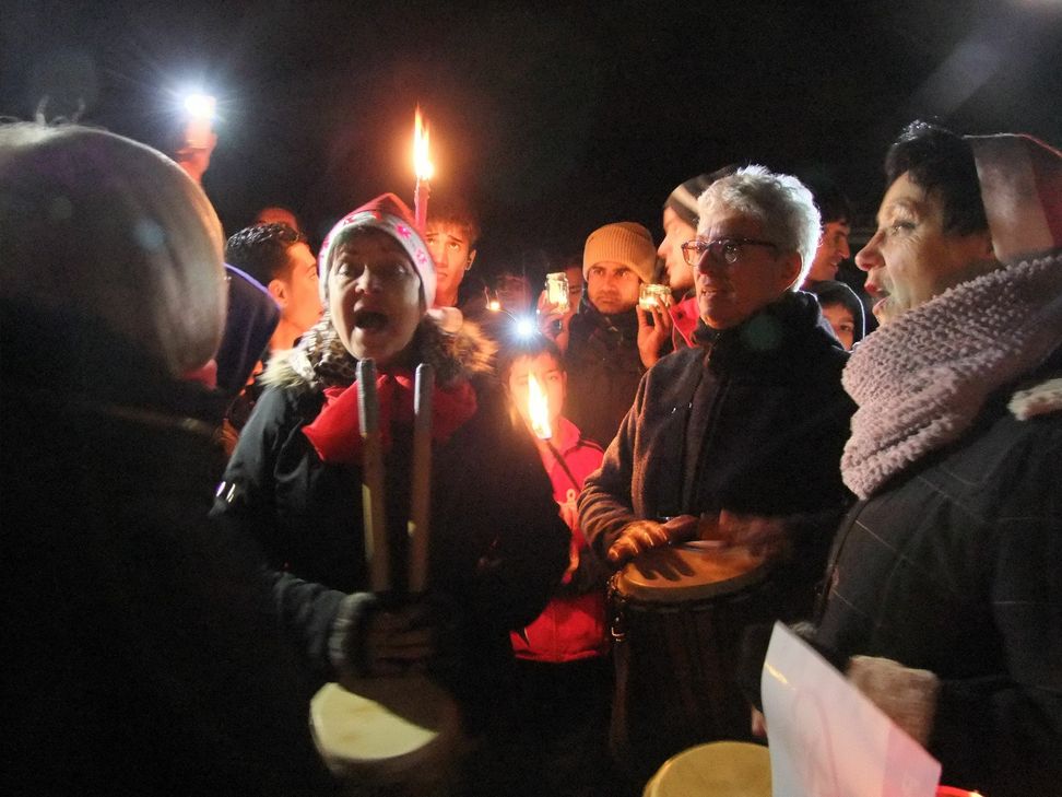 Dafür gab es viel Zuspruch von den anwesenden Menschen und den Vertretern von Stadt und Kirche. "Viele Menschen haben Angst vor den Füchtlingen, sagte beispielweise Diakon Andreas Webel. "Ich habe viele von ihnen kennengelernt. Man braucht vor diesen Menschen keine Angst zu haben", betonte Webel. So wie Webel sprachen auch Stadtbürgermeister Dr. Mathias Queck und AfA-Leiter Stefan Ding lobende Worte für die Aktion. Im Anschluss an die Einstimmung auf dem Gelände des Restaurant machten sich rund 400 Menschen mit Lichtern in den Händen auf den Weg zur Ex-Kaserne. Zur selben Zeit starteten etwa ebenso viele Flüchtlinge mit Fackeln und selbst gebastelten Laternen von ihrer Unterkunft in Richtung Stadt. Angeführt wurde die Truppe der Einheimischen von den drei Trommlerinnen Annemarie, Marita und Marlies aus Kell am See, deren kleine Formation sie "Ogologendu" nennt, was übersetzt so viel bedeutet wie "Ich wünsche dir Wohlergehen".