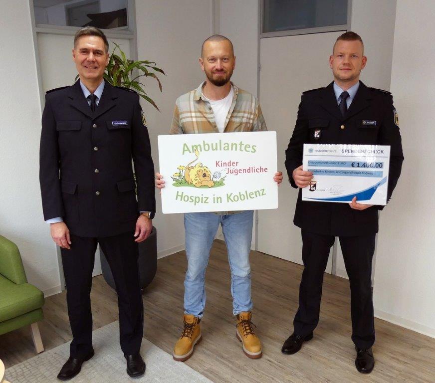 Polizeirat Henrik Natorp, stellvertretender Leiter der Bundespolizei Trier und Erster Polizeihauptkommissar Thorsten Grünewald, Leiter Bundespolizeirevier Koblenz, überreichten den symbolischen Spendenscheck an Herrn Daniel Liefke als Vertreter des Hospizes.