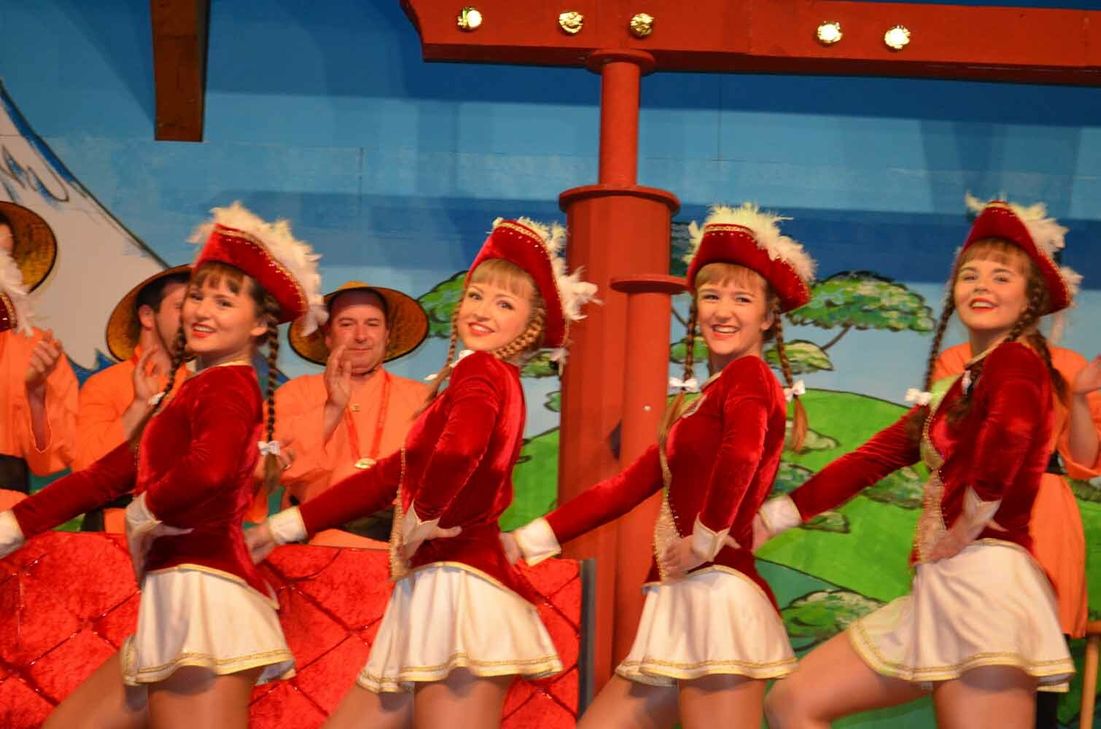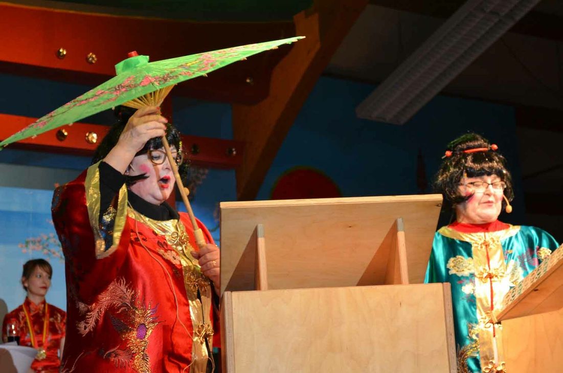Souverän präsentierte Sitzungspräsident Andreas Heiser in der ausverkauften Mehrzweckhalle ein ausgewogenes Menü aus Reden, Musik, Gesang und Tanz – von den jüngsten Aktiven, den Tanzmäusen, über die Jugendgarde nebst Solomariechen bis hin zu den "Kleinen Elfen". Ein absoluter Höhepunkt dabei der Auftritt der Juniorengarde (Foto), die sich im Dezember den Titel des Deutschen Meisters im Gardetanz der Rheinischen Karnevals Kooperation (RKK) sicherte. Mit "Buddha-Brot" und "Buddha-Milch" traf Johannes Heiser (Foto) zielsicher den Geschmack des Publikums, und auch "Bärbelchen und Trautchen" (Georgette Faldey und Erika Oberhausen, Foto) ließen es sich nicht nehmen, anlässlich des Vereinsjubiläums noch mal in die Bütt zu steigen. Mit Bauerngarde, Pratzbähnt und dem Duo "No Name", die allesamt bereits Kultstatus in Irsch genießen, feierten rund 300 Geishas, Samurai und Asien-Fans ausgelassen bis tief in die Nacht. DW, Fotos: Wiesner