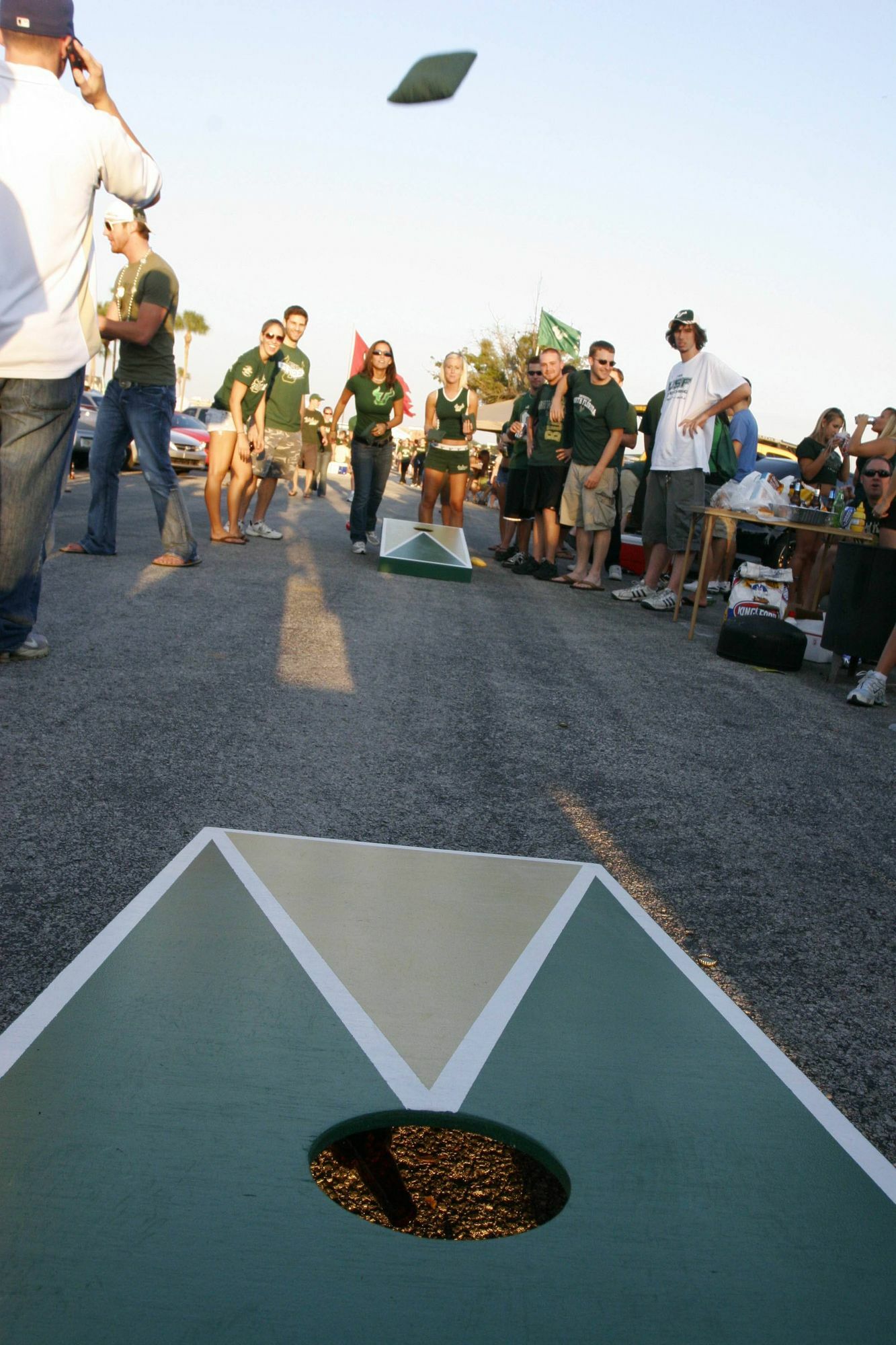 Beim Cornhole werden mit Mais gefüllte kleine Säcke auf eine angehobene Plattform mit einem Loch geworfen Foto: imago images / ZUMA Press