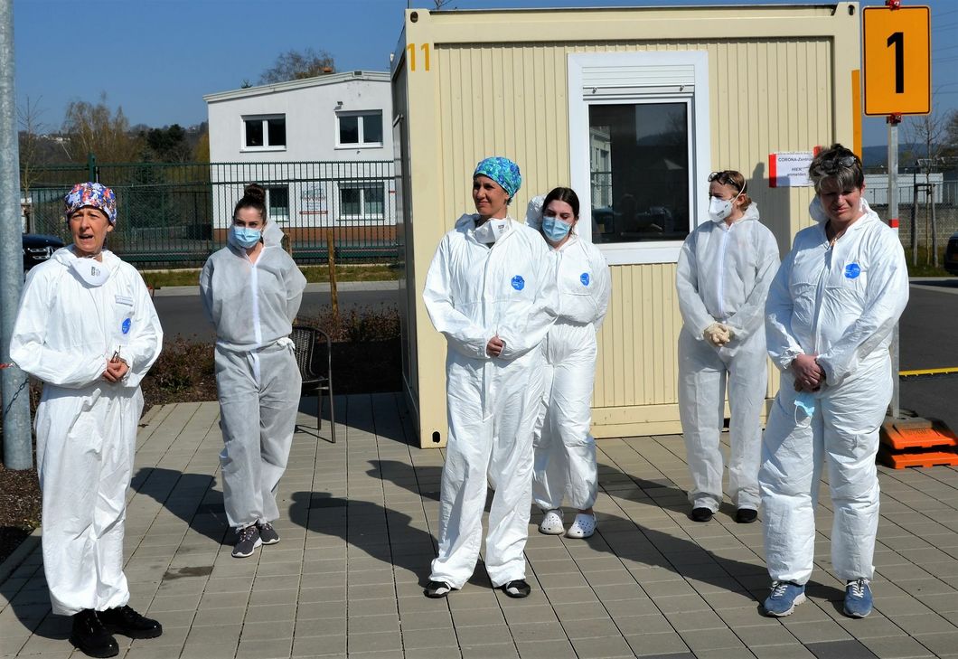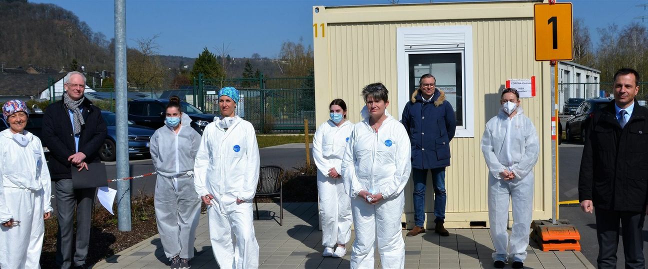 Christian Weiskopf, Regionalleiter Trier der BBT-Gruppe zu der das Brüderkrankenhaus gehört, betonte bei einem Pressetermin vor der Praxis in Ehrang, dass die Anzahl der Tests im Corona-Center im Messepark im Lauf der Woche zurückgegangen sei. Insgesamt seien 420 Abstriche gemacht worden. Auch in Koblenz werde eine Fieberambulanz erst einmal wieder geschlossen, informierte Weiskopf. Er dankte dem Team der Hausarztpraxis für seinen Einsatz, da die Mitarbeiterinnen und Mitarbeiter im Messepark nun wieder im stationären Bereich in den Krankenhäusern einsetzt werden könnten. „Das Agieren während dieser Krise zeigt, dass Trier eng zusammen steht“, betonte Weiskopf. Dem Dank an das Team der Hausarztpraxis schloss sich Dr. Christian Sprenger, medizinischer Geschäftsführer des Mutterhauses, an. Er gehe davon aus, dass die Herausforderungen noch wachsen, sagte er, betonte jedoch auch, das gemeinsame Auftreten vieler Akteure in Trier während der Krise. „Wir zählen auf die Vernunft aller“, sagte Sprenger im Hinblick auf die derzeit geltenden Verhaltens- und Hygieneregeln. OB Wolfram Leibe sagte, dass im Messepark 600 bis 1000 Menschen pro Tag getestet werden könnten. Falls der Bedarf dafür bestehe, sei man dort auch innerhalb kürzester Zeit wieder arbeitsfähig. „Es ist ein Beispiel dafür, wie in Trier Hand in Hand gearbeitet wird“, so der OB. Ehrang: 200 Abstriche, viermal positiv Dr. Karin Gutmann-Feisthauer informierte, dass das Team der Praxis bislang 450 Patienten untersucht habe. 200 Abstriche wurden gemacht, von denen vier positiv für das Coronavirus ausfielen. Gutmann-Feisthauer betonte, bei den Patienten werde nicht nur ein Abstrich gemacht, sie würden auch untersucht. Eine Überweisung des Hausarztes sei nicht nötig. Bei Bedarf stehen in Ehrang auch noch zwei Container für Tests bereit, die in Betrieb genommen werden können, wenn weitere Praxen die Fieberambulanz unterstützen möchten. Geöffnet ist die Fieberambulanz in Ehrang, Unter dem Dostler 2, von Montag bis Freitag zwischen 7.30 und 18 Uhr und Samstags von 8 bis 13 Uhr. Eine telefonische Anmeldung unter 0651/967910-0 ist wünschenswert. Die Patienten warten, nachdem sie Namen und Handynummer mitgeteilt haben, in ihrem Auto auf dem Parkplatz, bis sie angerufen werden. Bis die Testergebnisse vorliegen dauert es drei bis vier Tage. Auch wenn der Test negativ ausfällt, bekommen die Patienten Bescheid. Das Corona-Center im Messepark ist noch diesen Samstag und Sonntag zwischen 10 und 14 Uhr geöffnet, ehe es in den Standby-Modus versetzt wird. Eine weitere Fieberambulanz gibt es in Saarburg in der psychiatrischen Tagesklinik neben dem Krankenhaus. Sie ist von Montag bis Freitag, 8 bis 16 Uhr, geöffnet. Dort ist ein Überweisungsschein des Hausarztes vorzulegen. Text: PA/Fin/ Fotos: Finkenberg