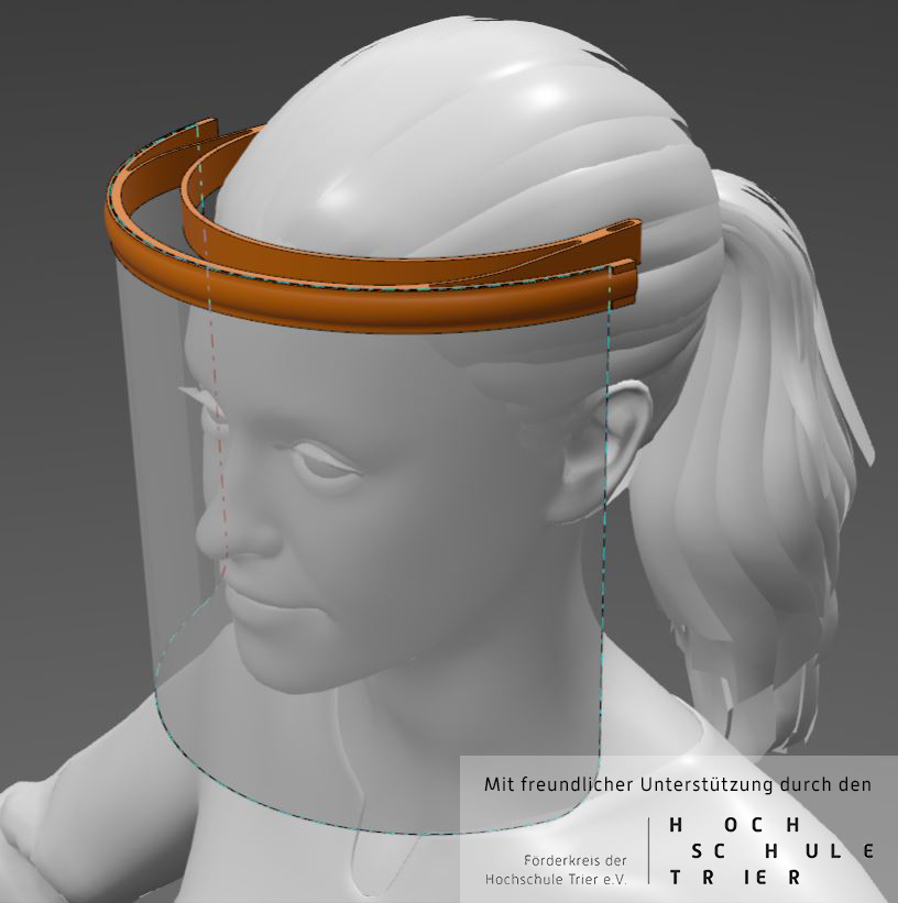 Es geht hier um einen Vollgesichtsschutz, der besonders in der Intensivmedizin eine höhere Schutzwirkung bietet als eine Schutzbrille. Diese Schutzschilder sollen zusätzlich zu den Atemschutzmasken neben den Mund-/ Nasen-schutzmasken vor allem auch die Augen vor potentieller Tröpfcheninfektion schützen, sind allerdings im Moment schwer bzw. nicht mehr zu beziehen. Nach einem Hilferuf der Oberärztin Dr. Angela Rzepecki-Jäger aus dem Mutterhaus Trier machte sich ein kleines Team des LDPF unter der Leitung von Michael Hoffmann sofort an die Arbeit. Auf der Grundlage eines bereits bestehenden Entwurfs des Unternehmens Prusa Research aus Tschechien, der in Zusammenarbeit mit dem lokalen Gesundheitsministerium entwickelt und als "non-commercial licence" veröffentlicht wurde, erarbeitete das Team in Trier einige wesentliche Verbesserungen. Das Schutzschild besteht aus einem Halter und einer austauschbaren Schutzfolie mit einer Schiene zur Aussteifung. Das Schild wird mit einem Gummiband am Kopf befestigt.