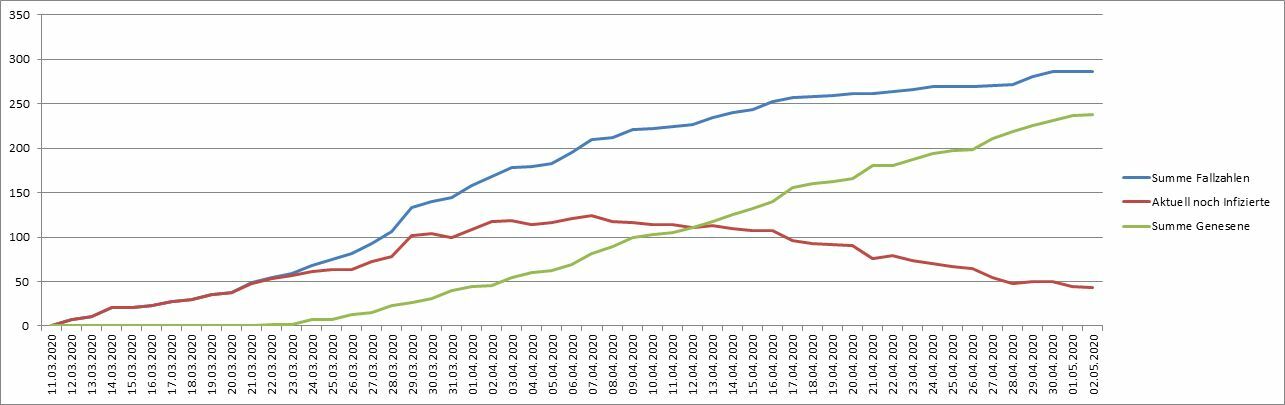 Bisher sind seit dem 28. März sechs Personen aus dem Zuständigkeitsbereich des Gesundheitsamtes verstorben: zuletzt am 25. April eine Patientin aus dem Landkreis Trier-Saarburg. Inzwischen konnten insgesamt 243 Quarantäneverfügungen vormals positiv getesteter Personen aufgehoben werden. Dabei handelt es sich um 153 Personen aus dem Landkreis und 90 aus der Stadt Trier.