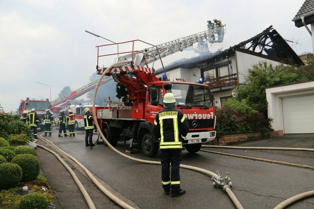 Aus noch ungeklärter Ursache kam es am Samstagnachmittag, 2. September, zu einem Dachstuhlbrand in einem Mehrfamilienhaus in der Straße "In der Olk" in Gusterath. Als die ersten Feuerwehren ankamen, stand der Dachstuhl bereits im Vollbrand. Mit mehreren Trupps im Innenangriff, sowie über zwei Drehleitern im Außenangriff, versuchten sie den Flammen Herr zu werden. Nach einiger Zeit hatten sie den Brand unter Kontrolle, jedoch dauerte es noch einige Zeit, bis das Feuer komplett gelöscht war. Da die Brandursache unklar ist, hat die Kriminalpolizei die Ermittlungen aufgenommen. Nach Angaben der Feuerwehr wurde niemand verletzt. Der Schaden dürfte sich im sechsstelligen Bereich bewegen. Im Einsatz war die Polizeiinspektion Trier sowie die Feuerwehren Gusterath, Pluwig, Gutweiler, Waldrach, Schöndorf, Sommerau und Hockweiler sowie die Berufsfeuerwehr Trier Löschzug eins. Foto: SIKO