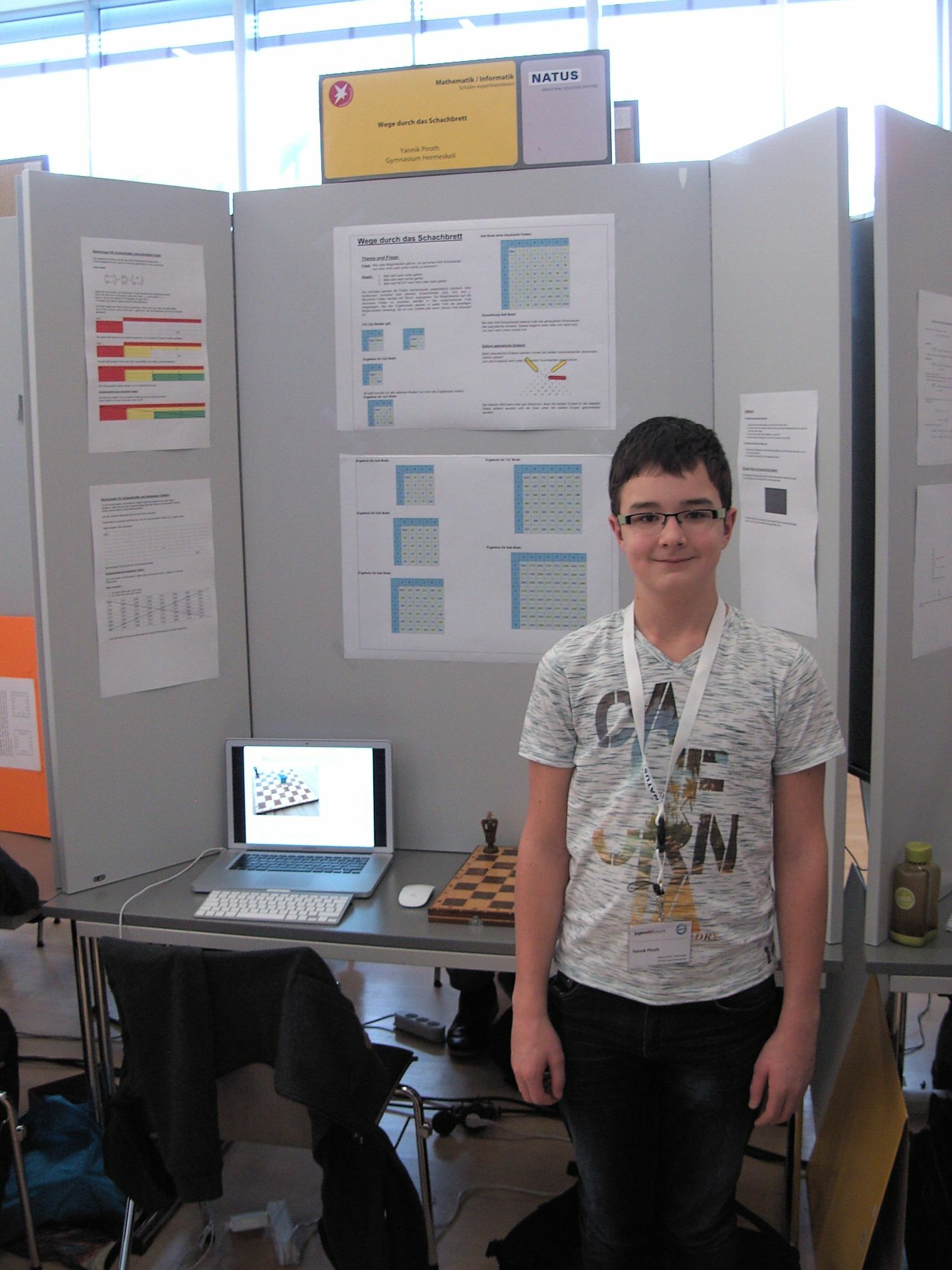 Mit Yannik Pieroth vertritt dieses Jahr wieder ein Nachwuchswissenschaftler vom Gymnasium Hermeskeil die Region Trier im Fachgebiet Mathematik/Informatik. Yannik Pieroth beschäftigte sich mit möglichen Wegen auf Schachbrettern mit und ohne blockierten Feldern. Dabei fand er einen Zusammenhang zum Pascalschen Dreieck.