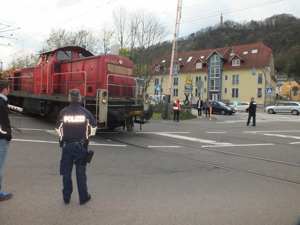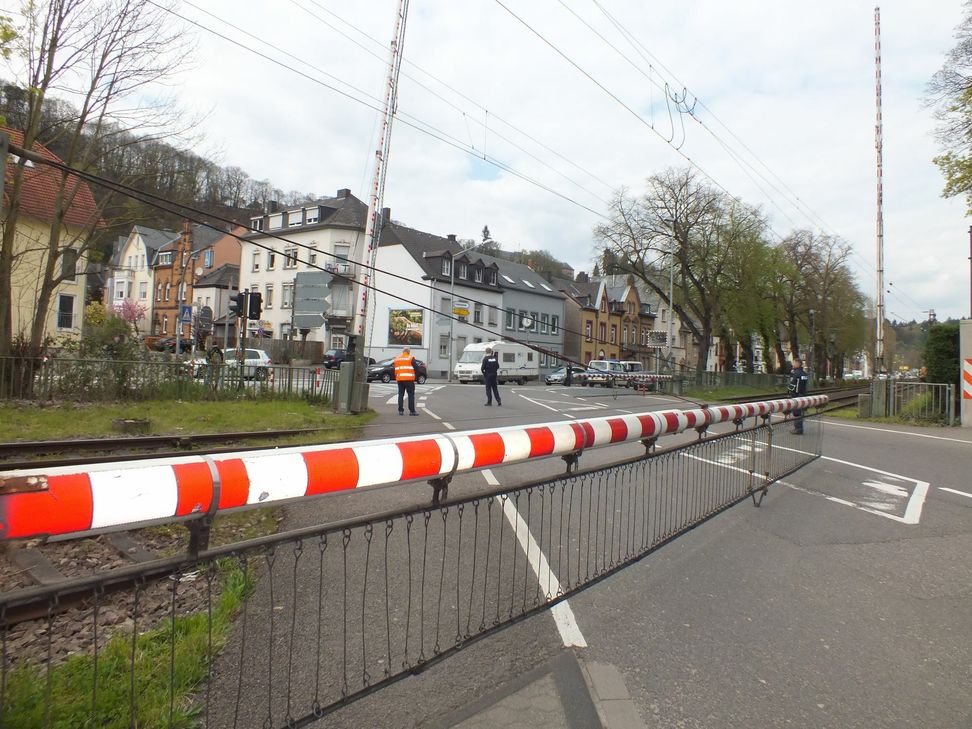 Die Polizei ist in Trier- West mit einem Großaufgebot und mehreren Einsatzfahrzeugen vor Ort, um den Verkehr umzuleiten. Ebenso ist ein Mitarbeiter des DB- Notfallmanagment vor Ort. Züge dürfen nur mit Schrittgeschwindigkeit den Bahnübergang passieren.